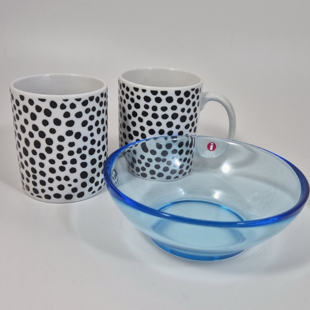 2st koppar marimekko, lite matta och repiga. Iittala skål Murminen i glas D,14cm