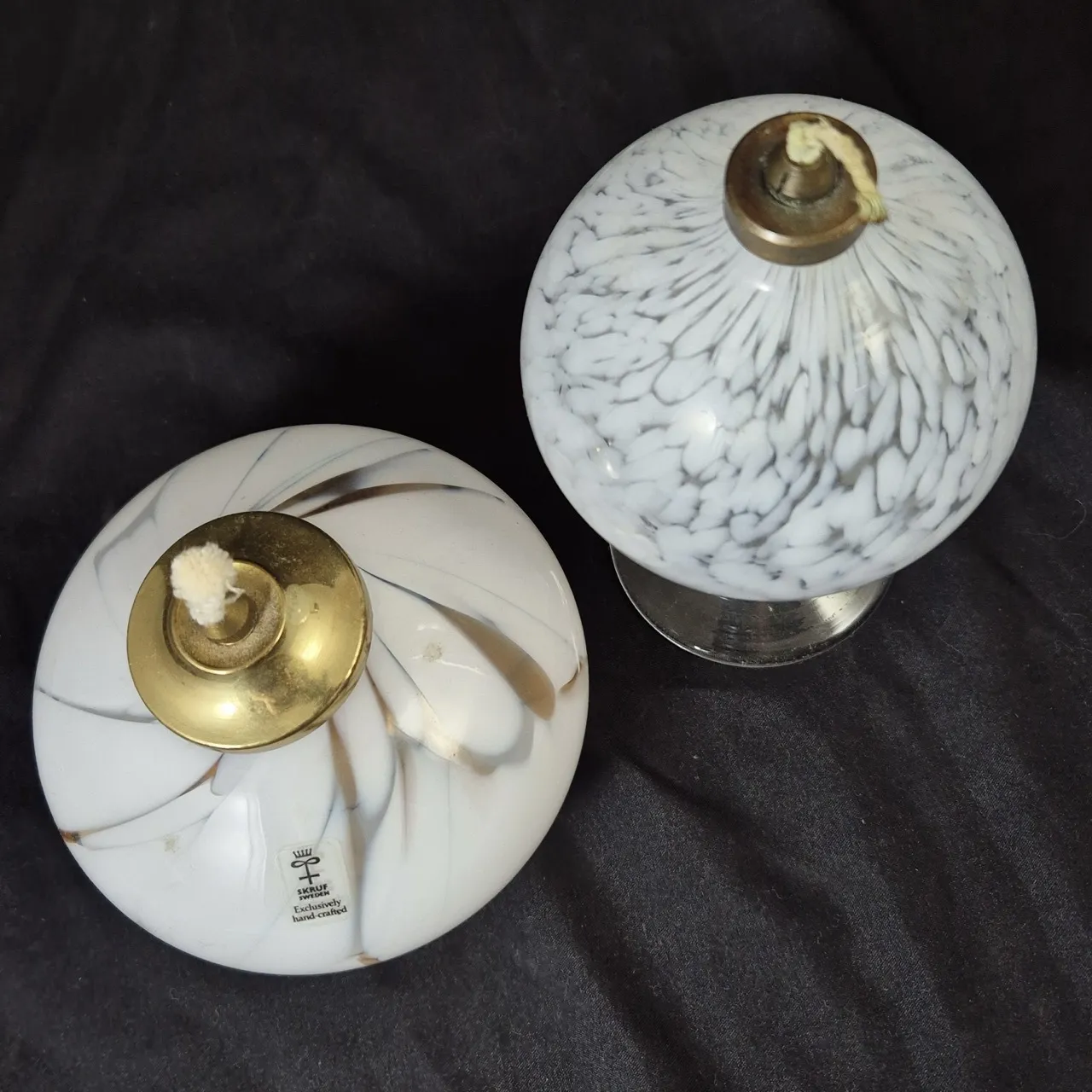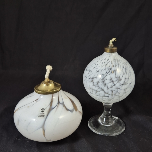 2st oljelampor. Olika men passar ihop. Den låga är från Skruf ca 11cm hög