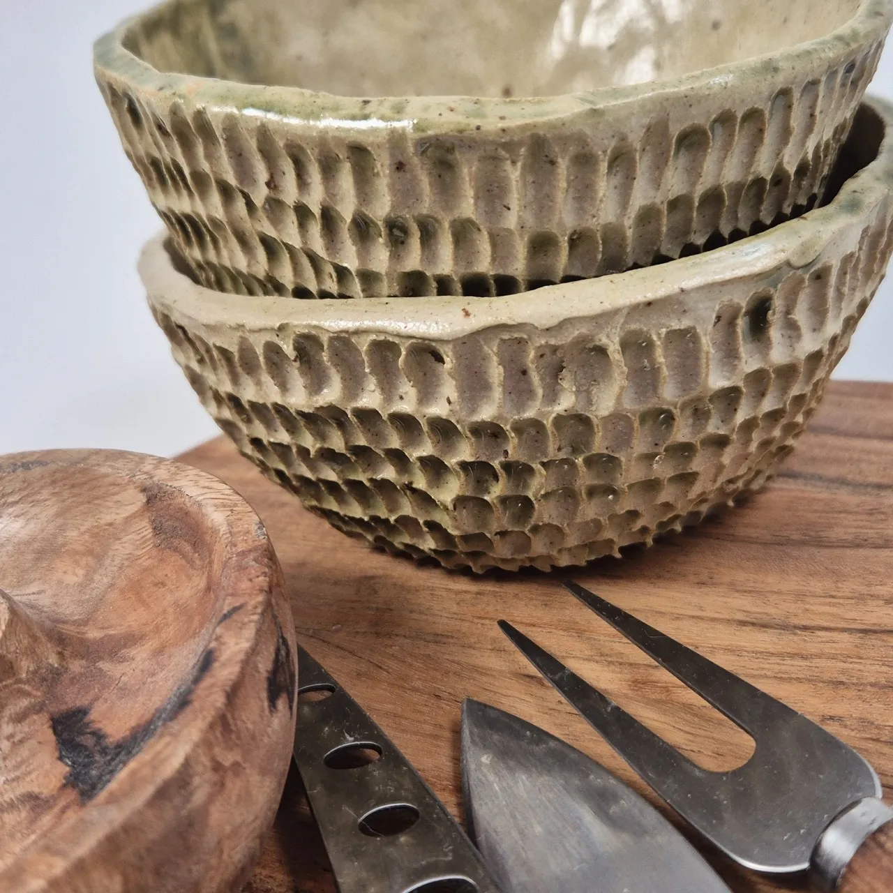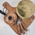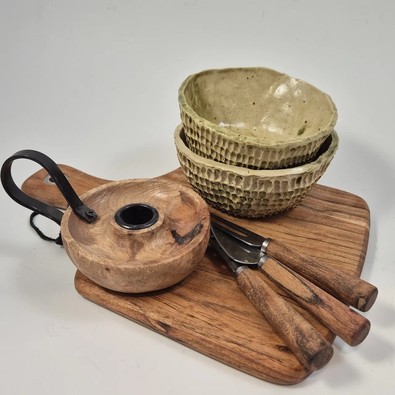 Skärbräda, ostknivar, ljusstake, 2st keramikskålar