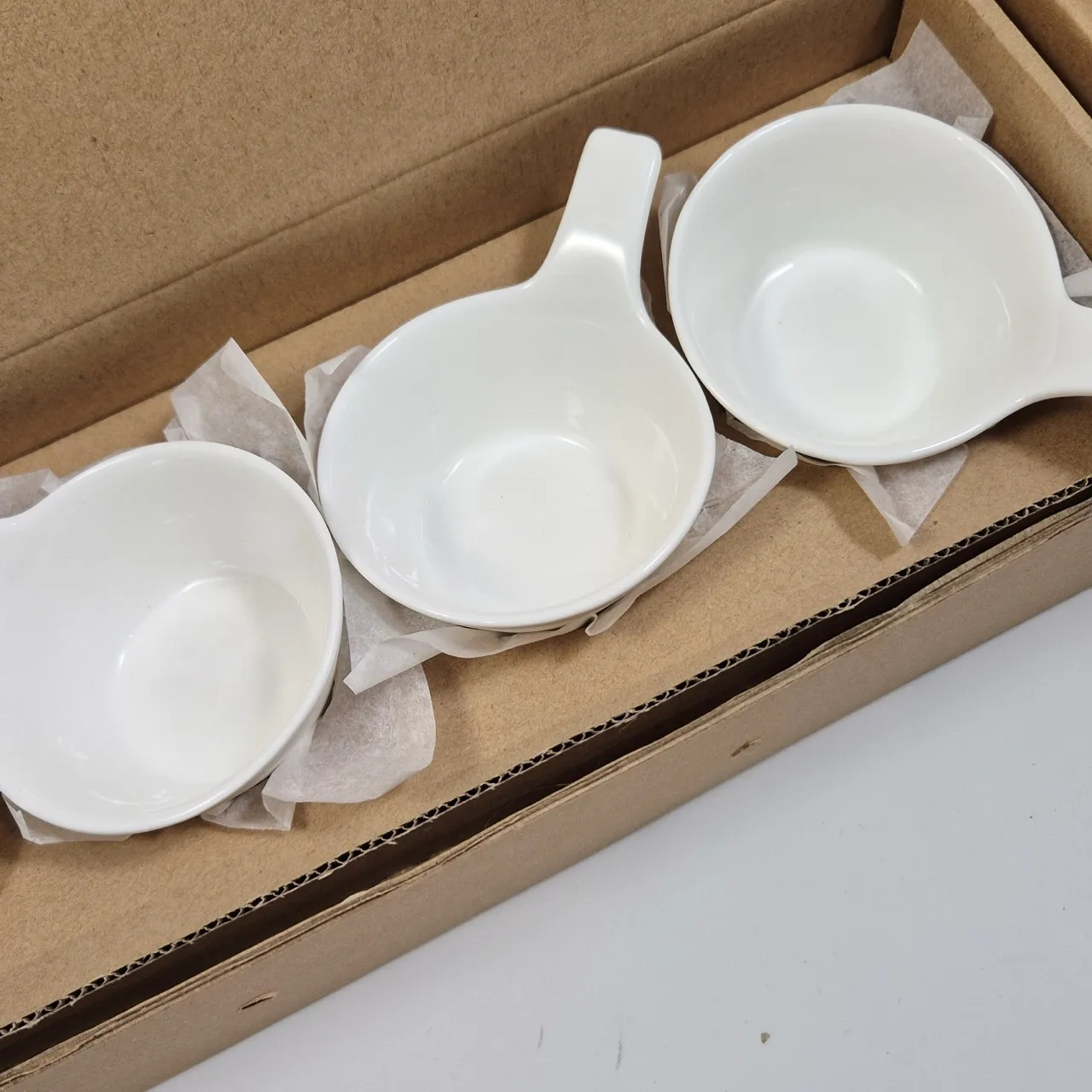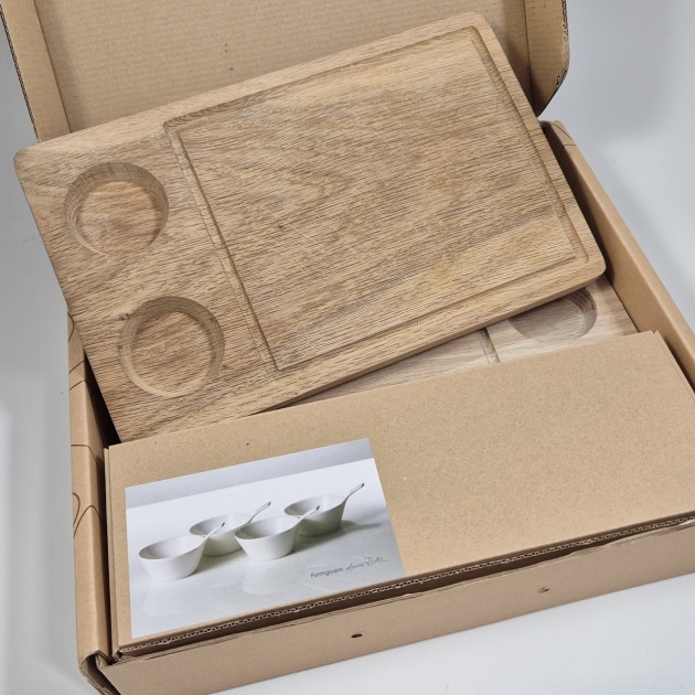 2st planksteksbrädor (en med repor), 4st såsskålar