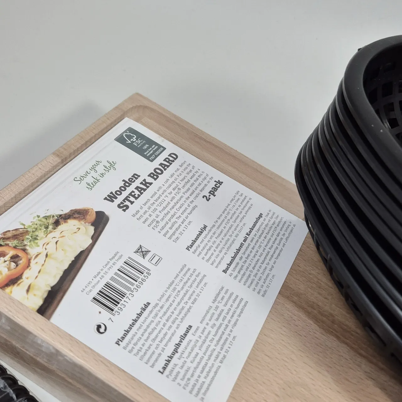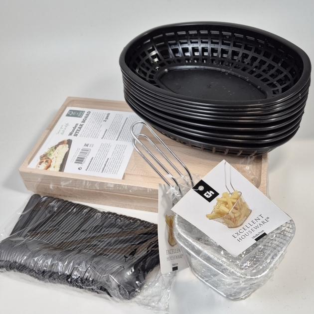 2st oanvända planksteksbrädor, 2st pommeskorgar, en förpackning gaffelskedar, 9st plastkorgar