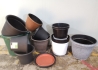 Massor av plastkrukor, utekrukor i modell större