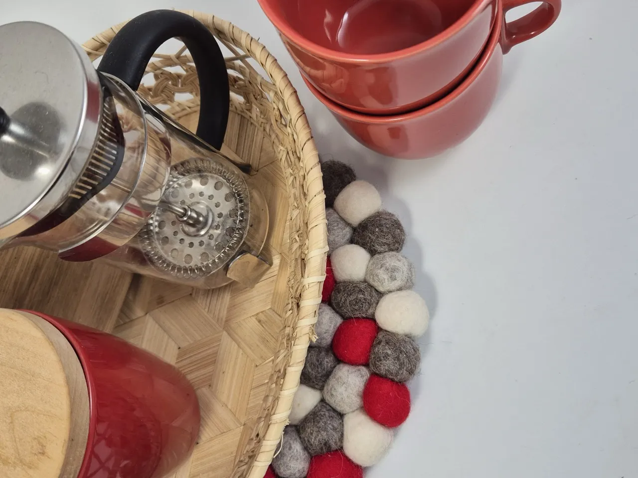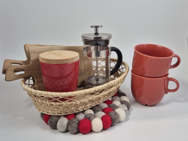 2st muggar, 1st presskanna, 2st smörgåsunderlägg, 1st höganäsburk, 1st grytunderlägg ull