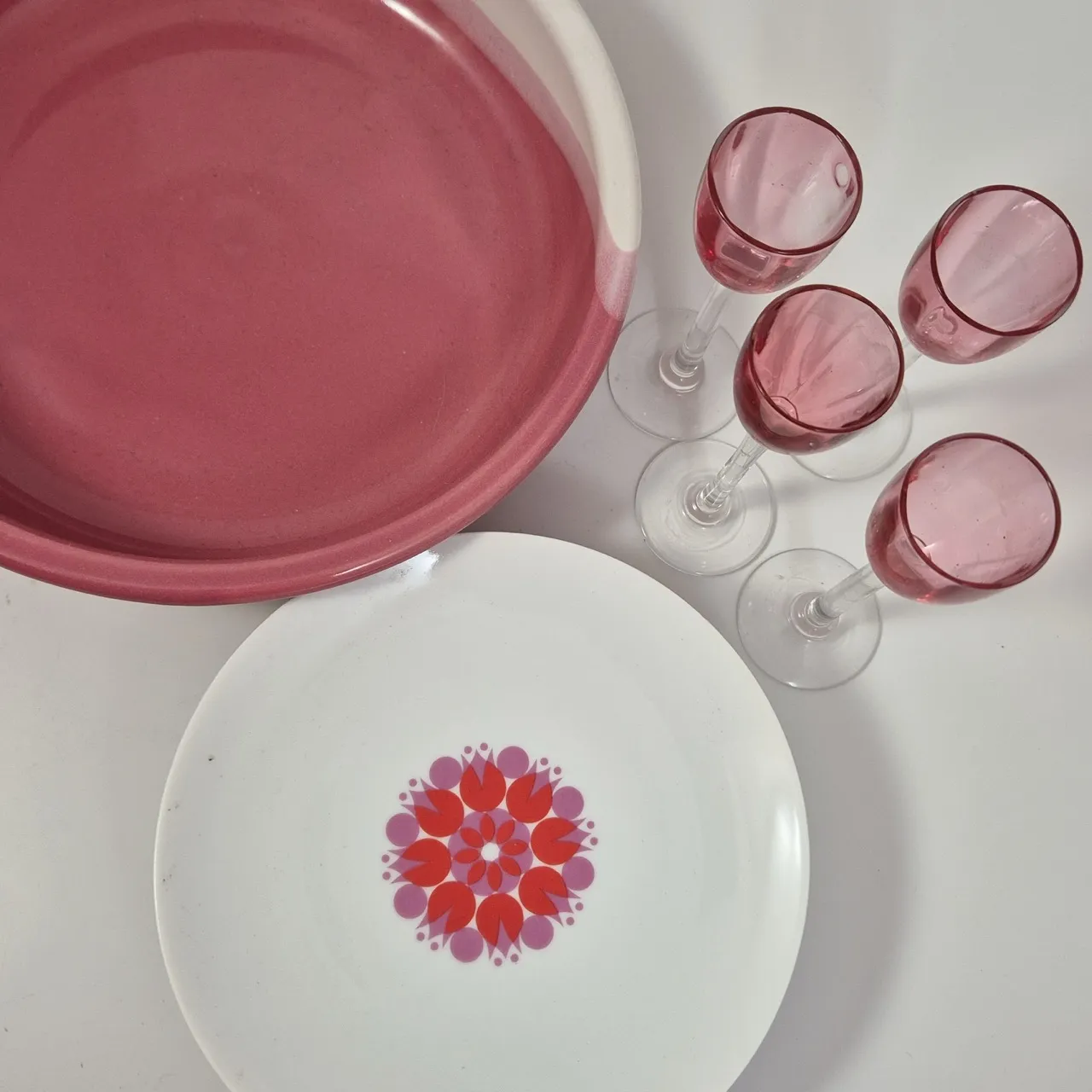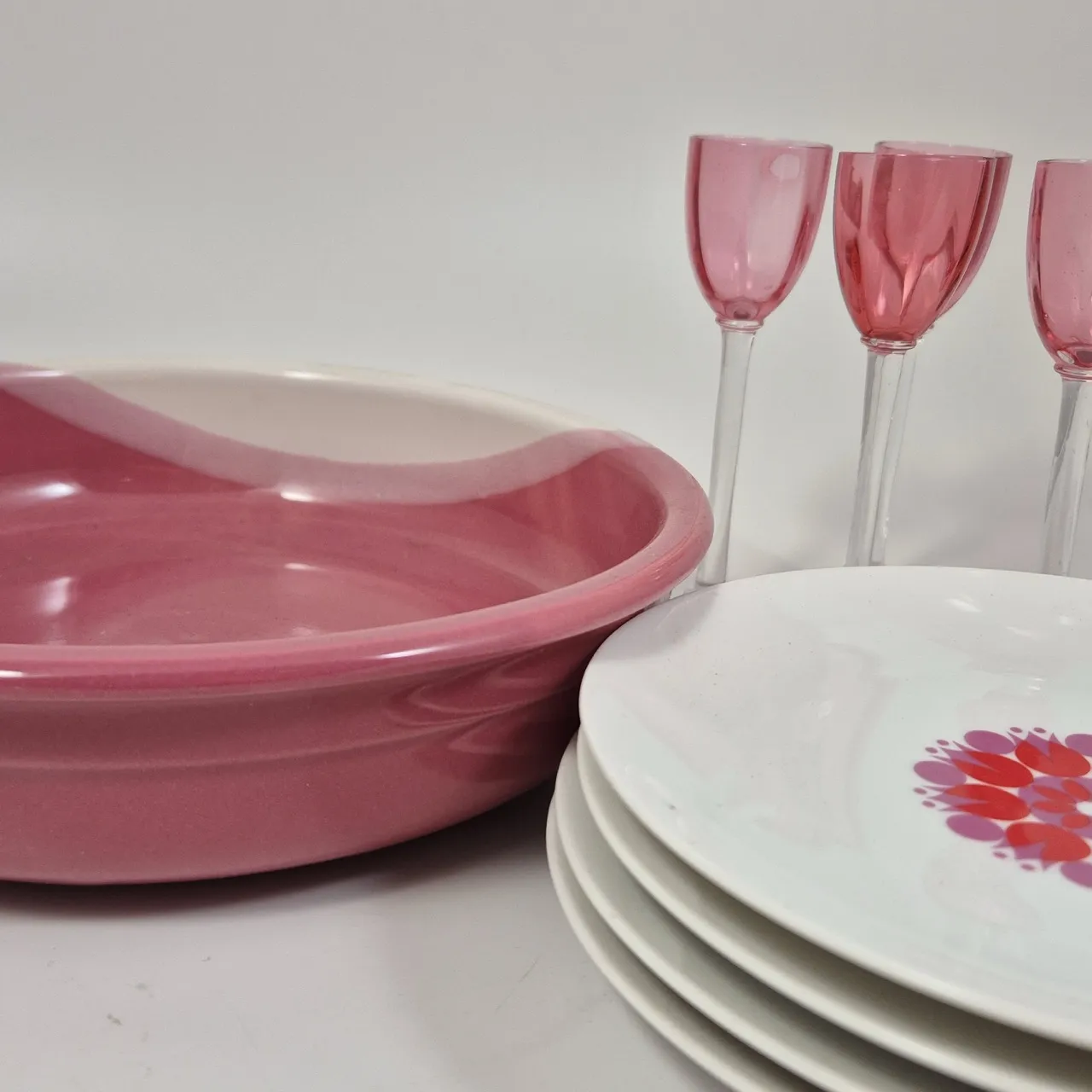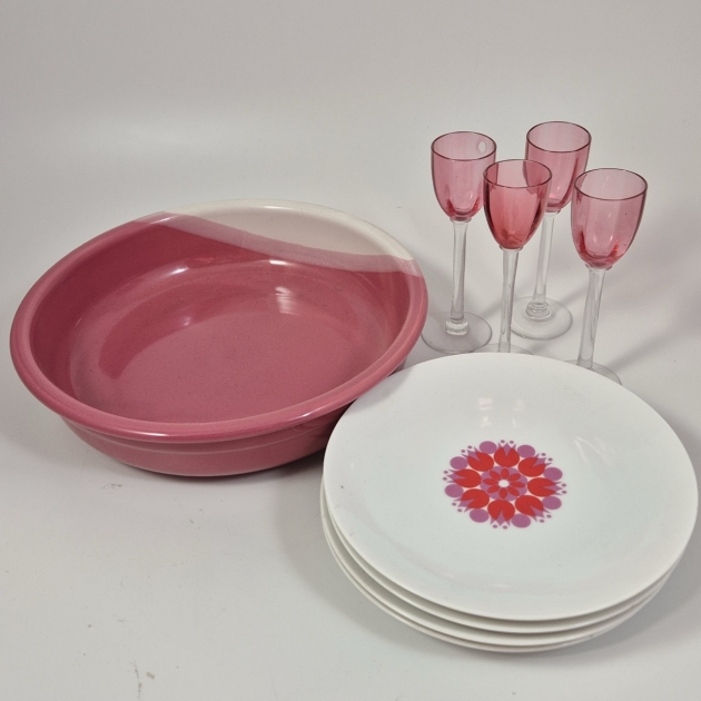 4st retro assietter, 4 st snapsglas på fot, 1st ugnsform D.25cm