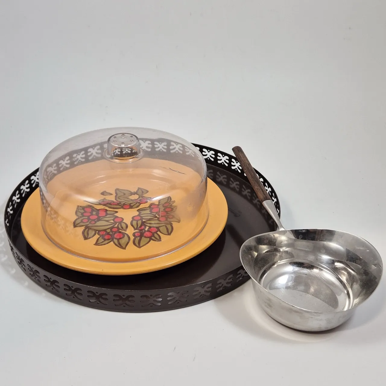 Retro ostkupa Emsa (spricka i kupan). Bricka i plåt D.30cm . smörskirare