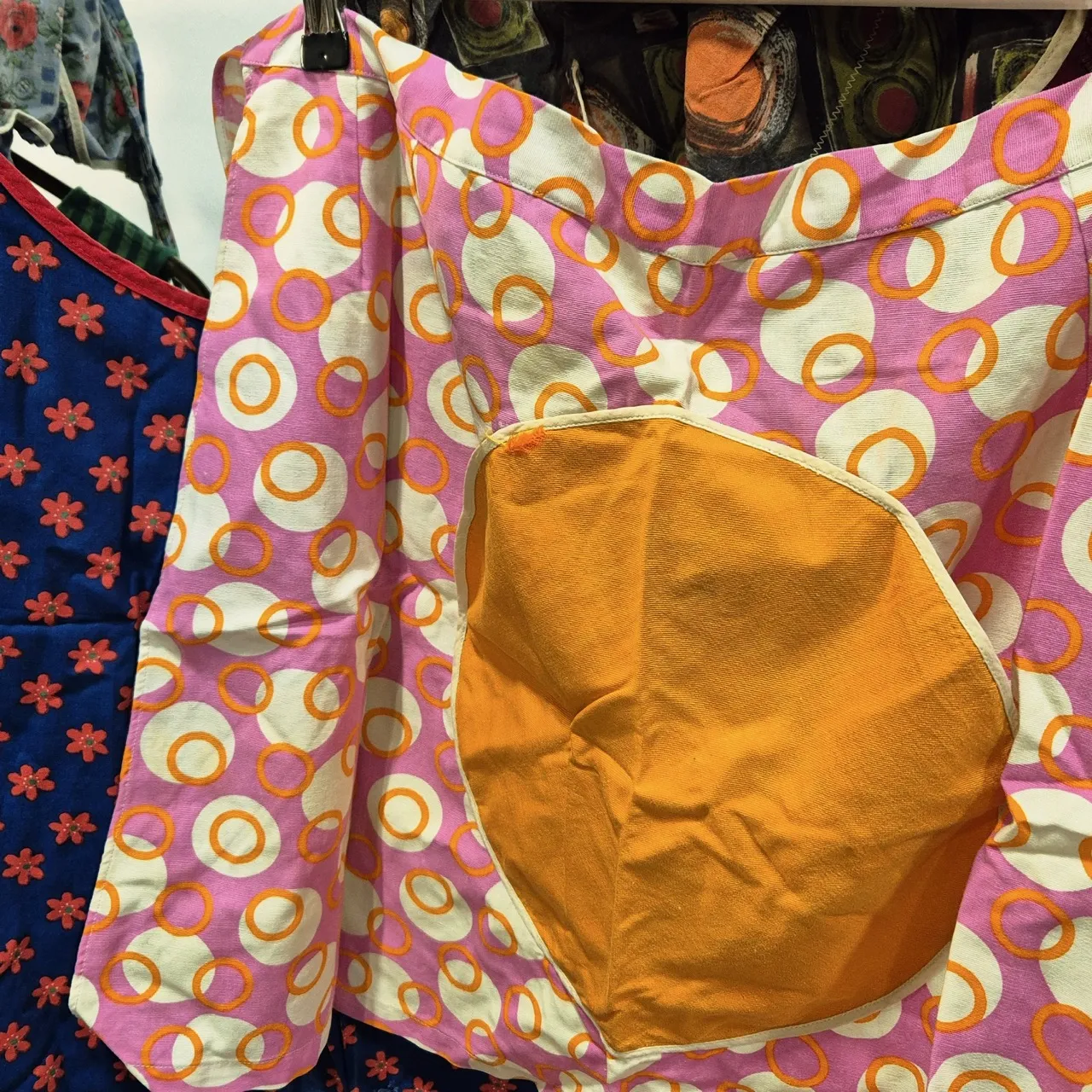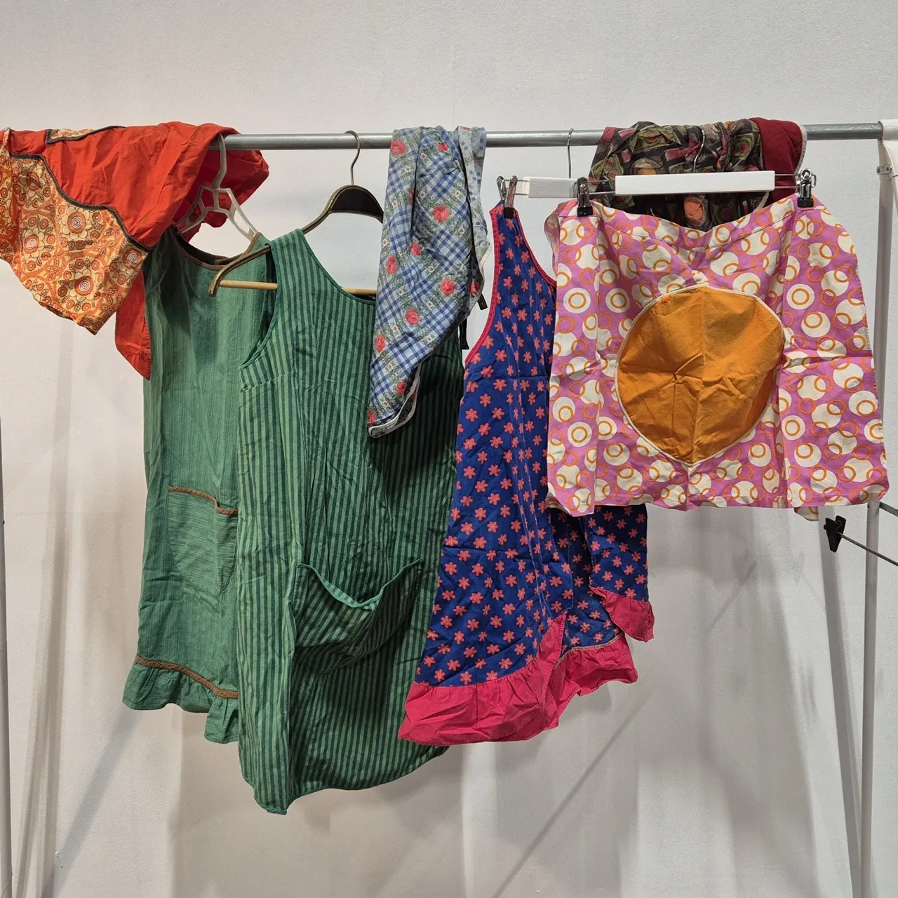 7st retro förkläden ( 3st västförkläden 4st midjeförkläden) . Vi är extra förtjusta i den rosa med den runda stor-fickan