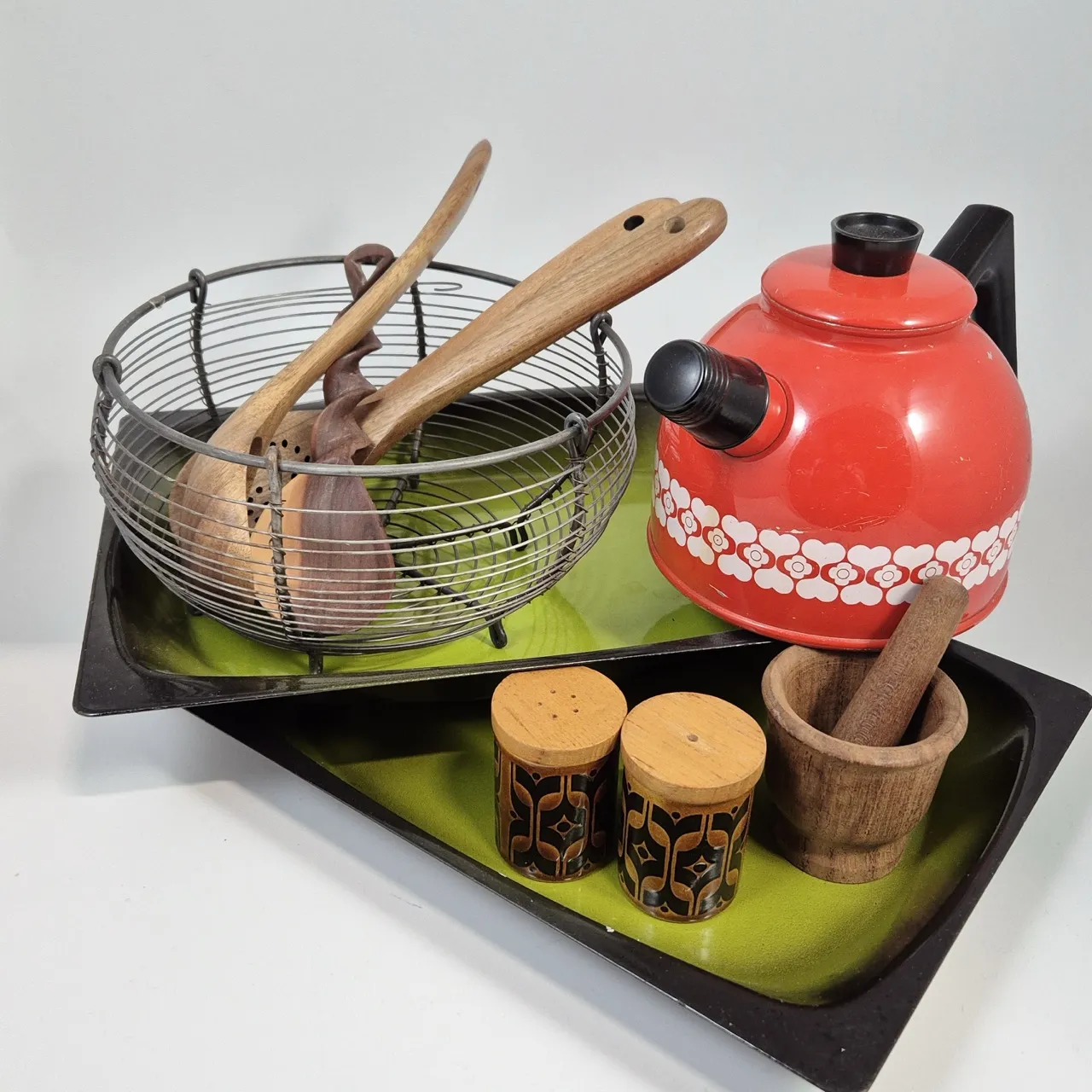 2st ugnsformar, mortel i trä, kaffepanna aluminium,  Träslevar,  med mer