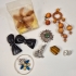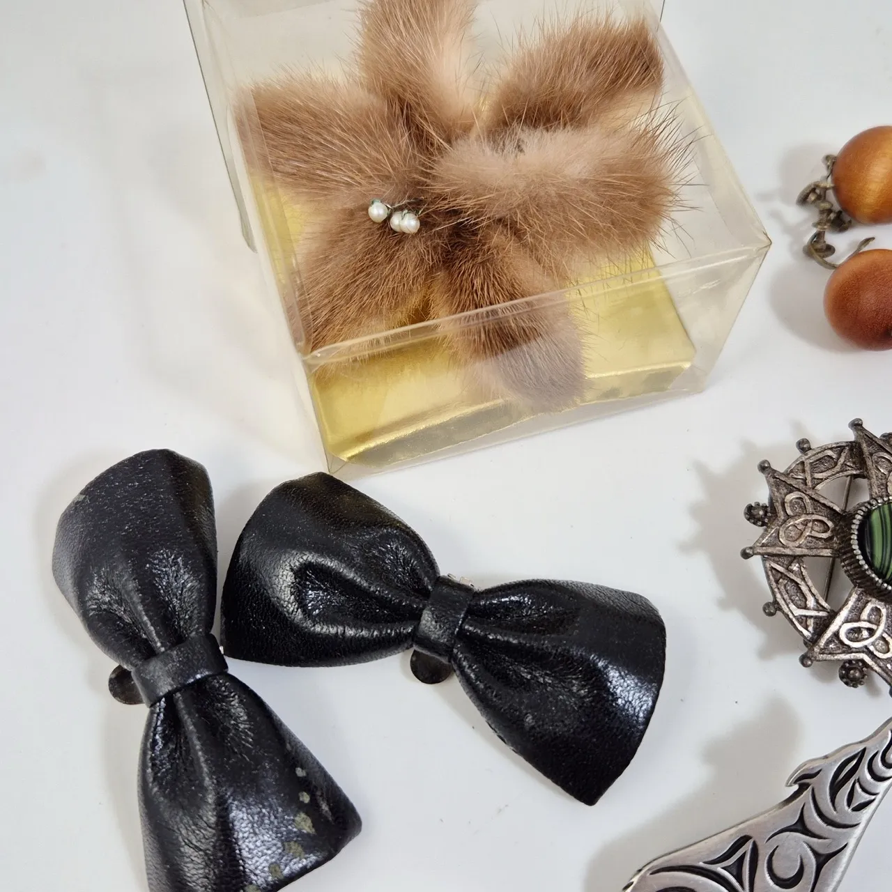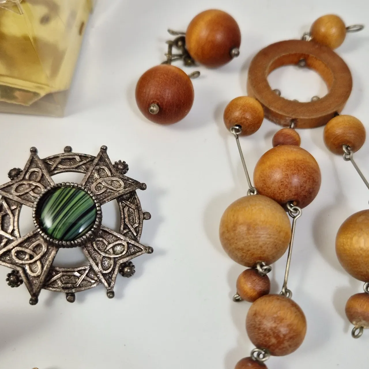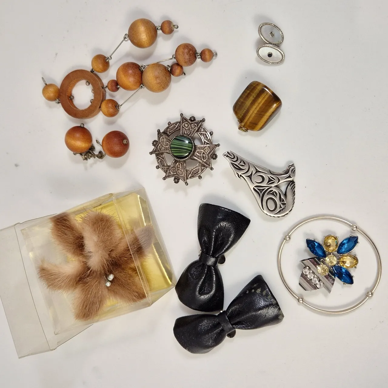 2st skorosetter, pälsbrosch, örhängen och halsband trä, Halsband med tigeröga , med mer