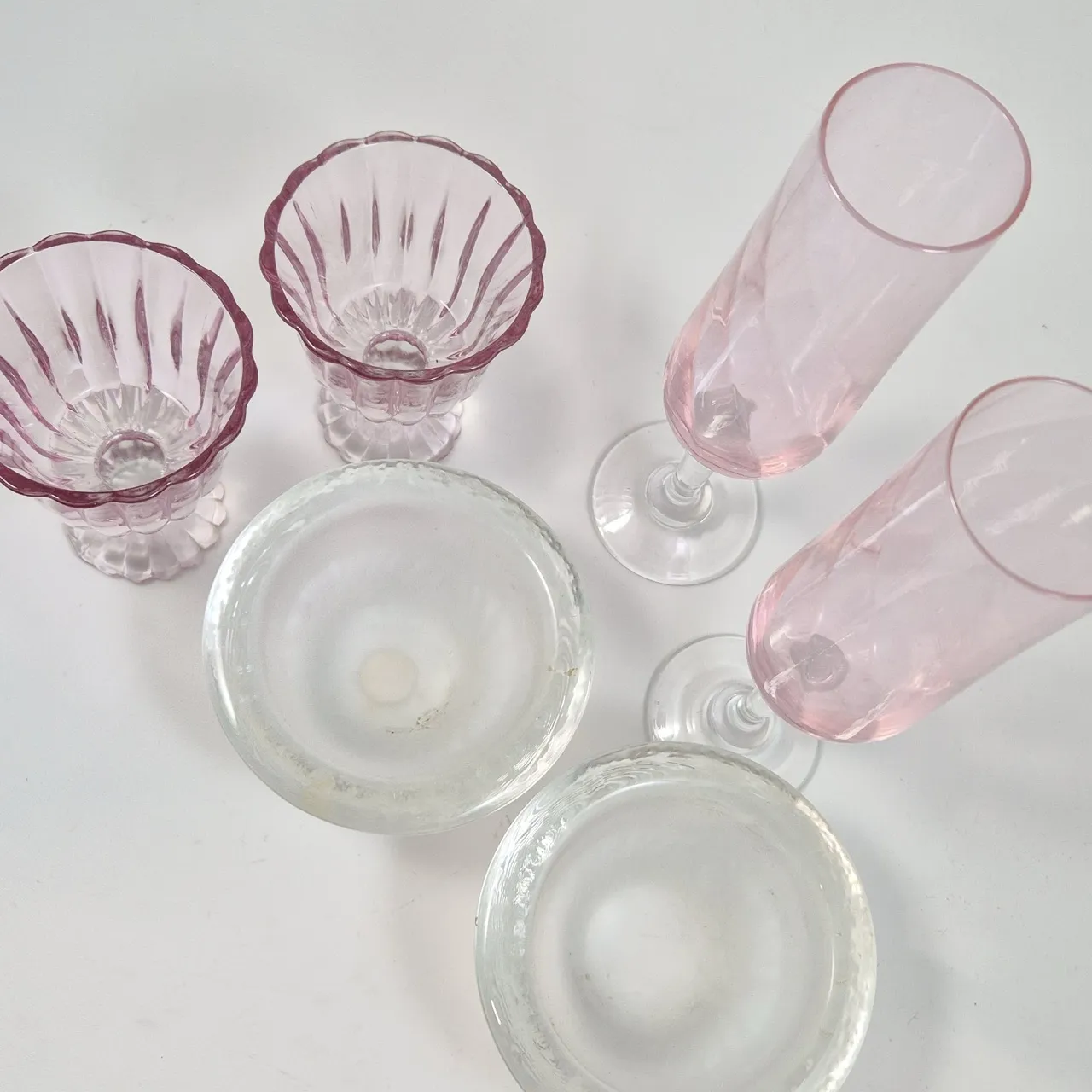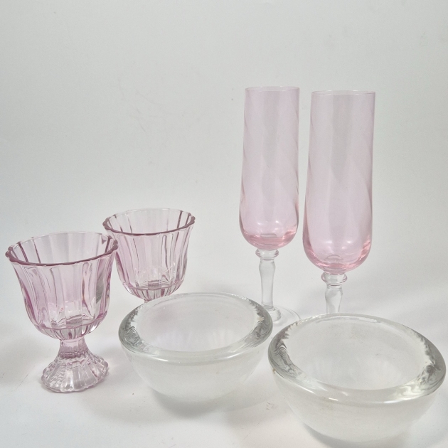2st rosa champagneglas, 2st rosa dessertglas, 2st glasskålar/lyktor