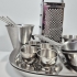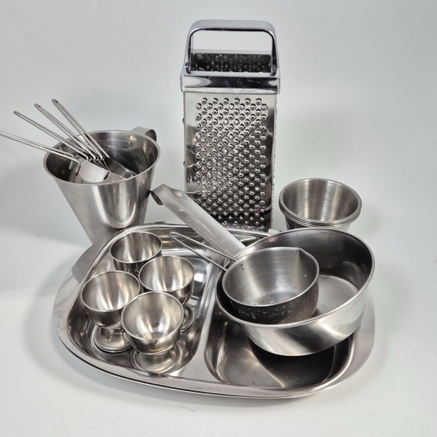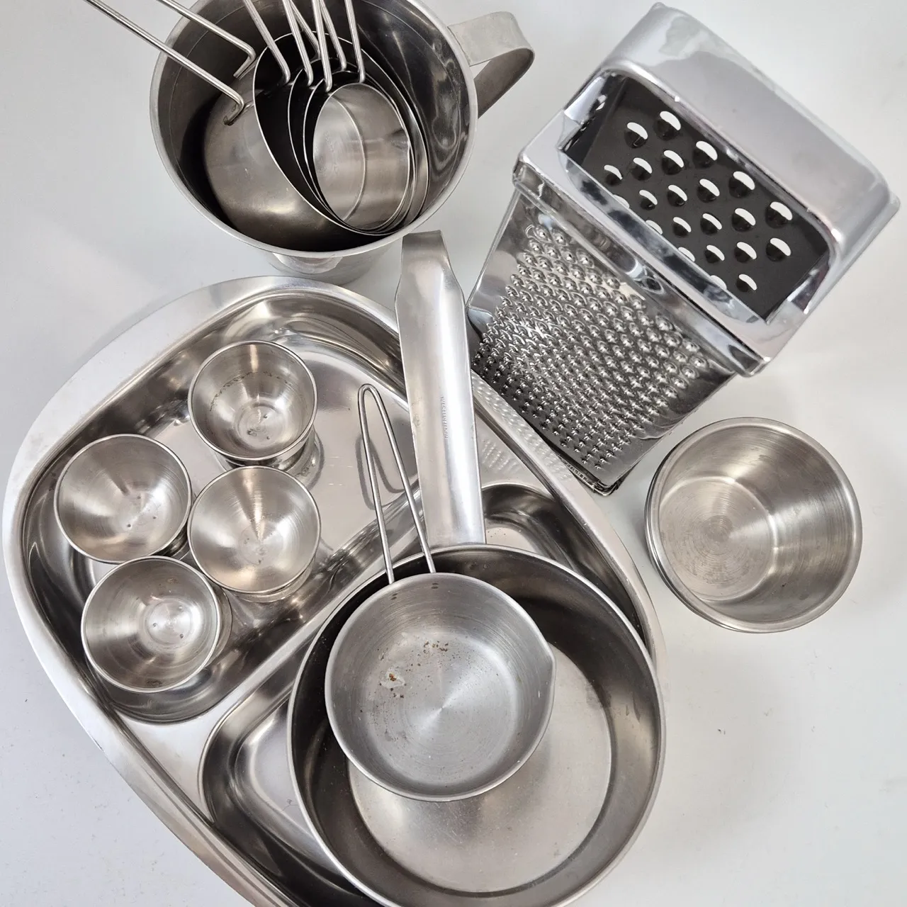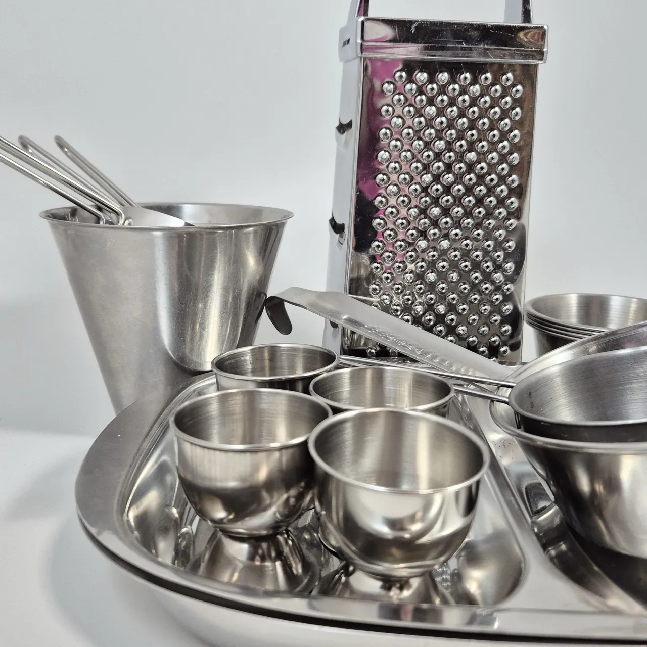 Rostfria rivjärn, serveringsfat, måttsatser, skopor, små skålar, äggkoppar