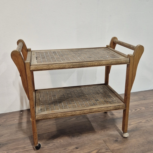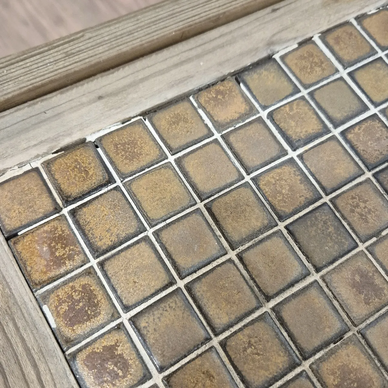 Rullbord. Slitage som om det stått utomhus. Saknar fog mellan mosaiken. Behöver skruvas åt. H.62cm 72x38cm
