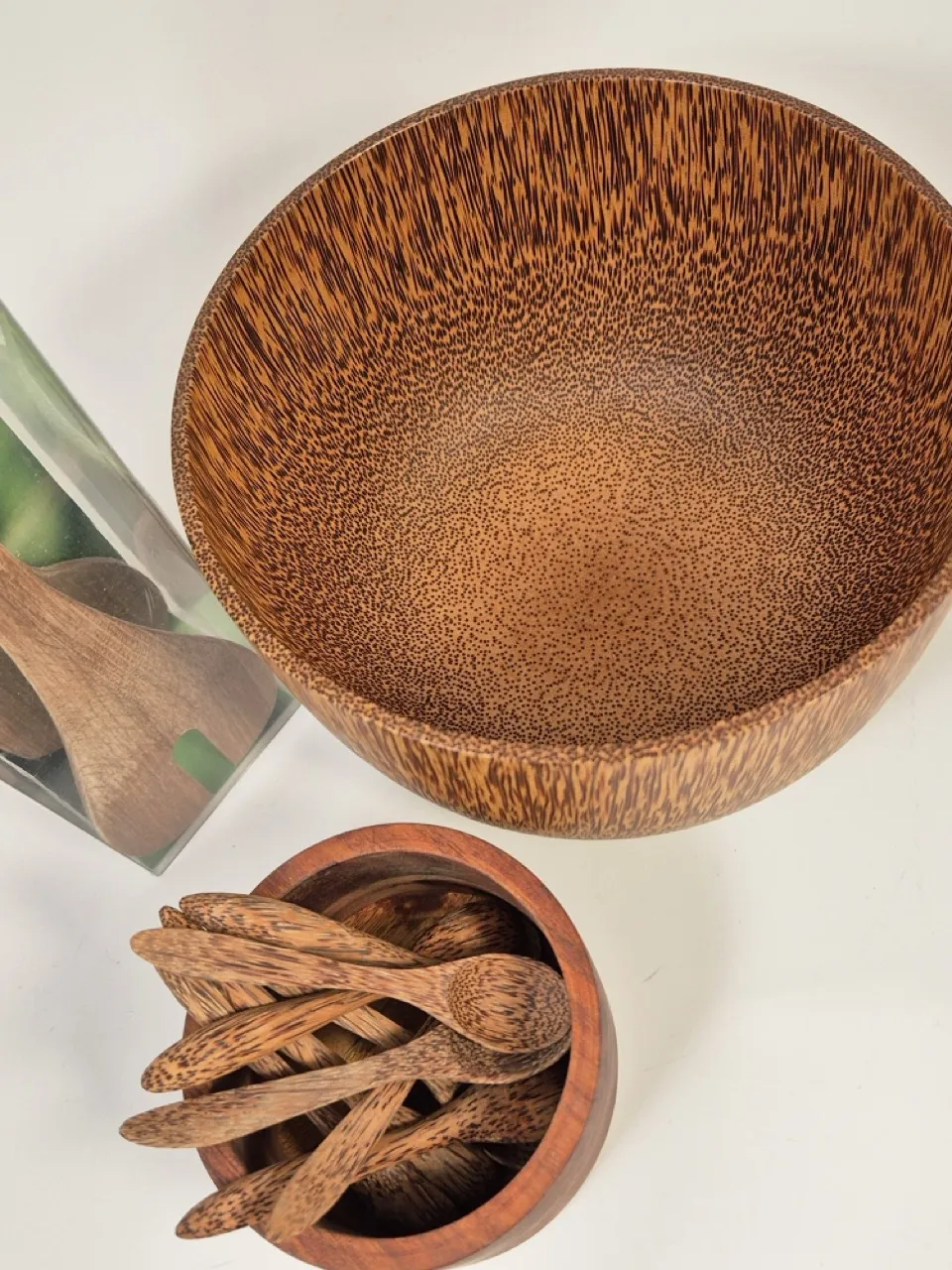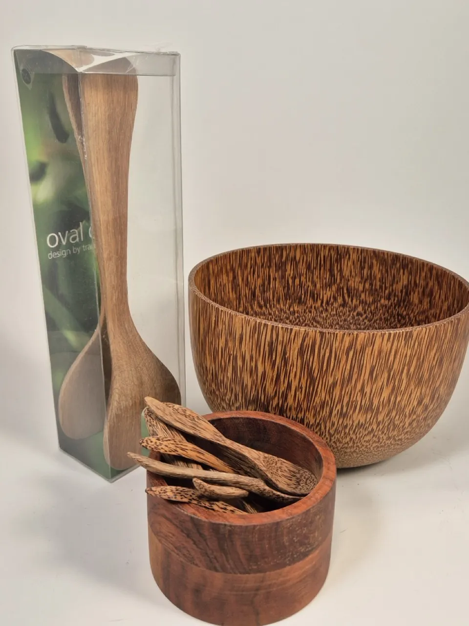 Salladsbestick Ek, Salladsskål D.22sm , 9st små träskedar , liten träskål