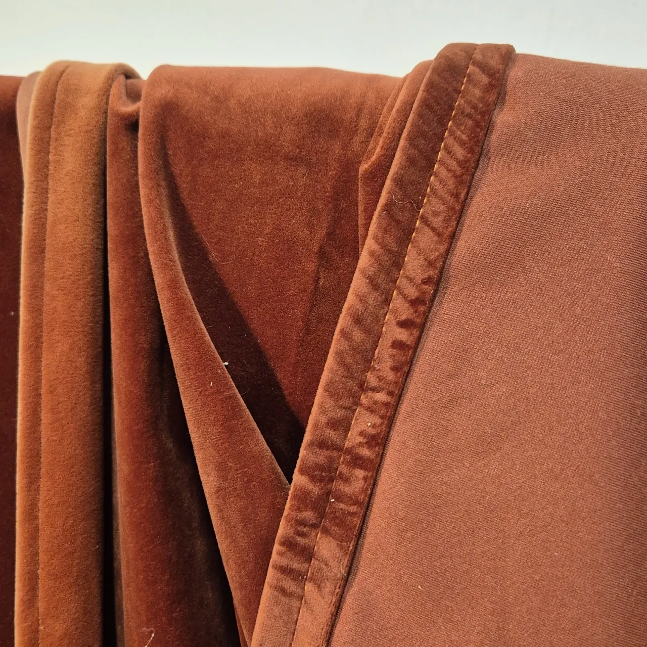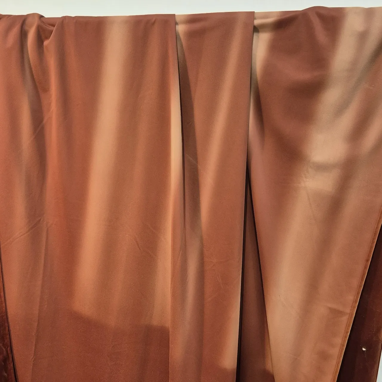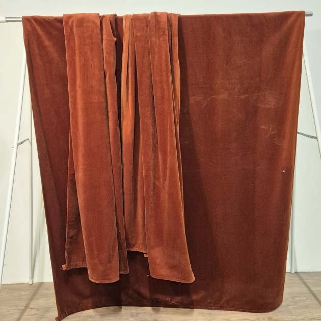 3st roströda sammetsgardiner . Solblekta partier finns, särskilt på baksidan . L.220cm