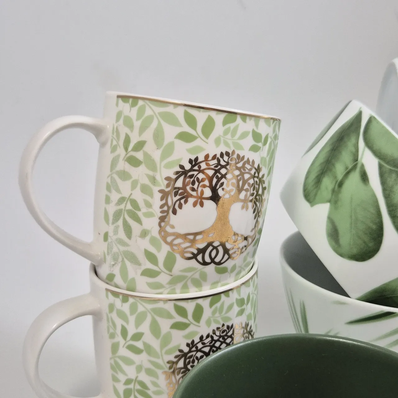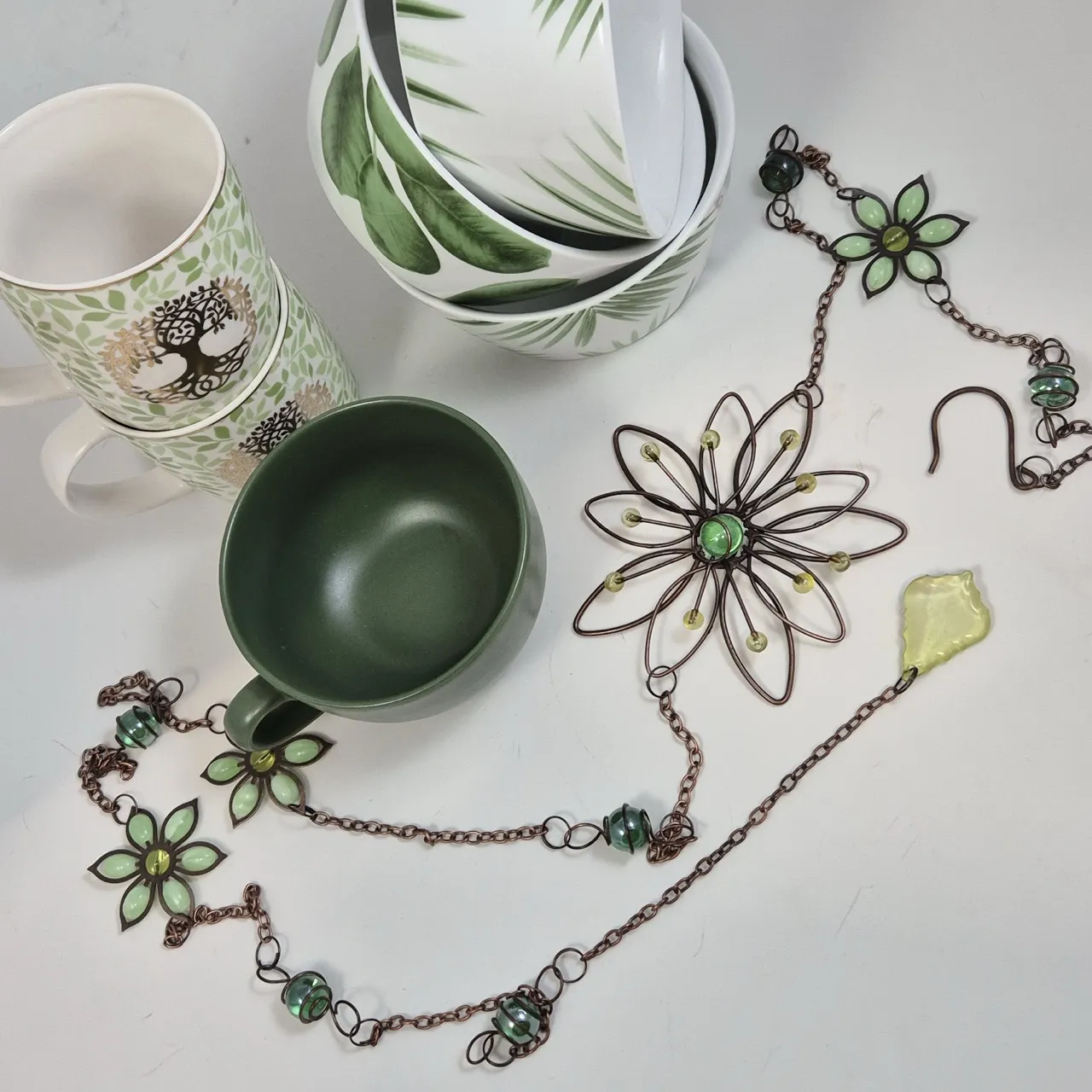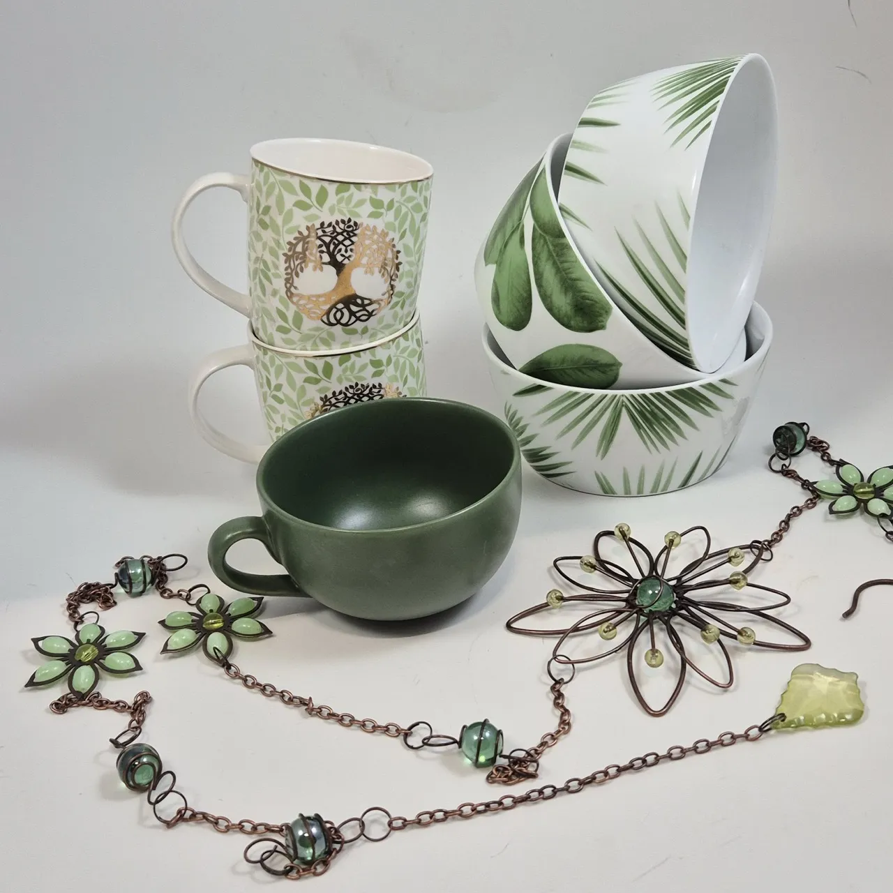 3st porslinsskålar med blas, 2st stora muggar med träd, 1st tekopp, 1st hängande dekoration L. ca 180cm .