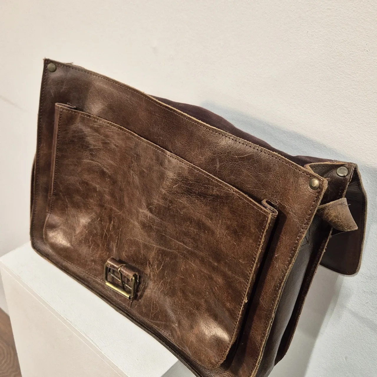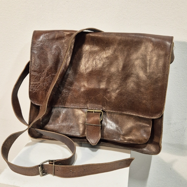Skinnväska, den rymmer en liten dator . Trasigt ovanför innerfickan. 26x35cm