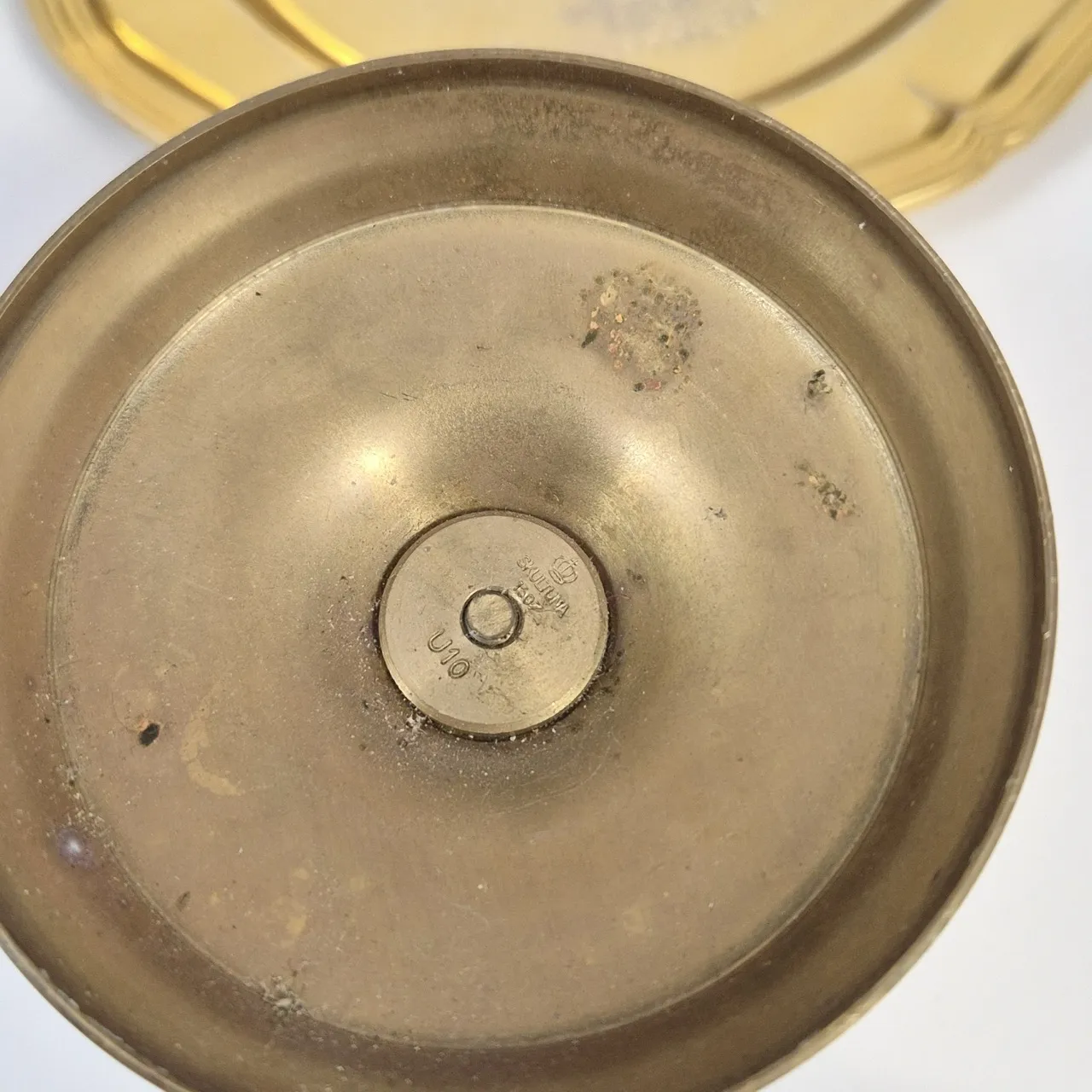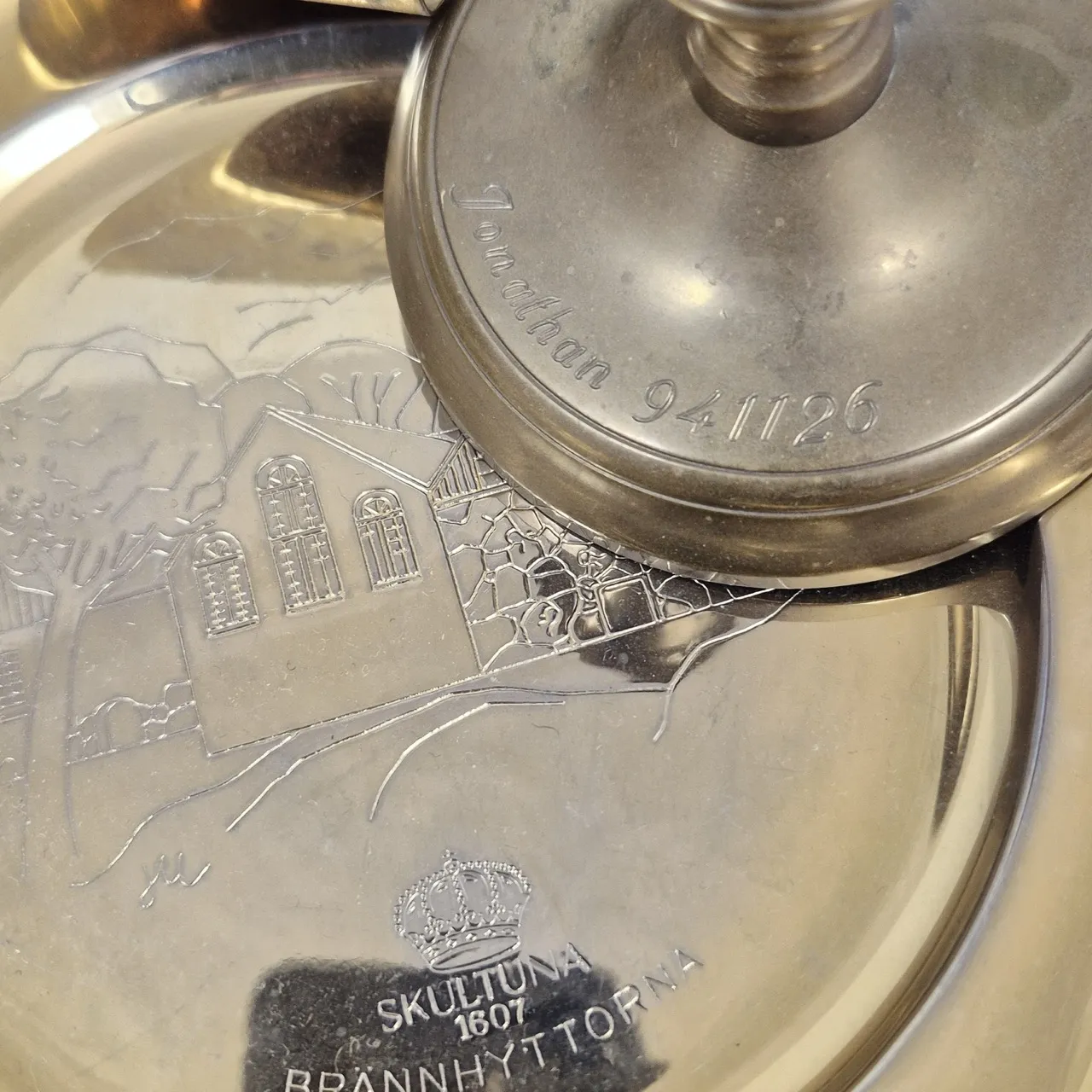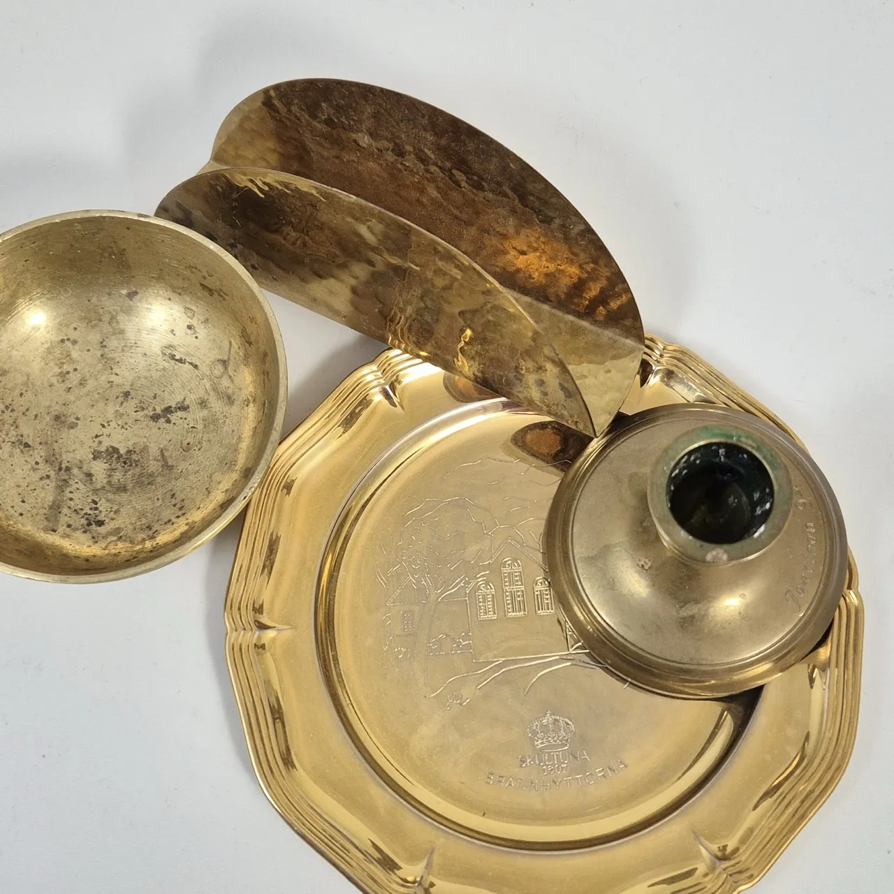 Skultura Ljusstake (graverad), skultuna fat med motiv, mässingsskål, Servetthållare