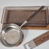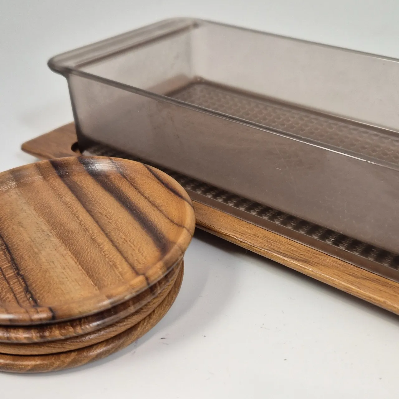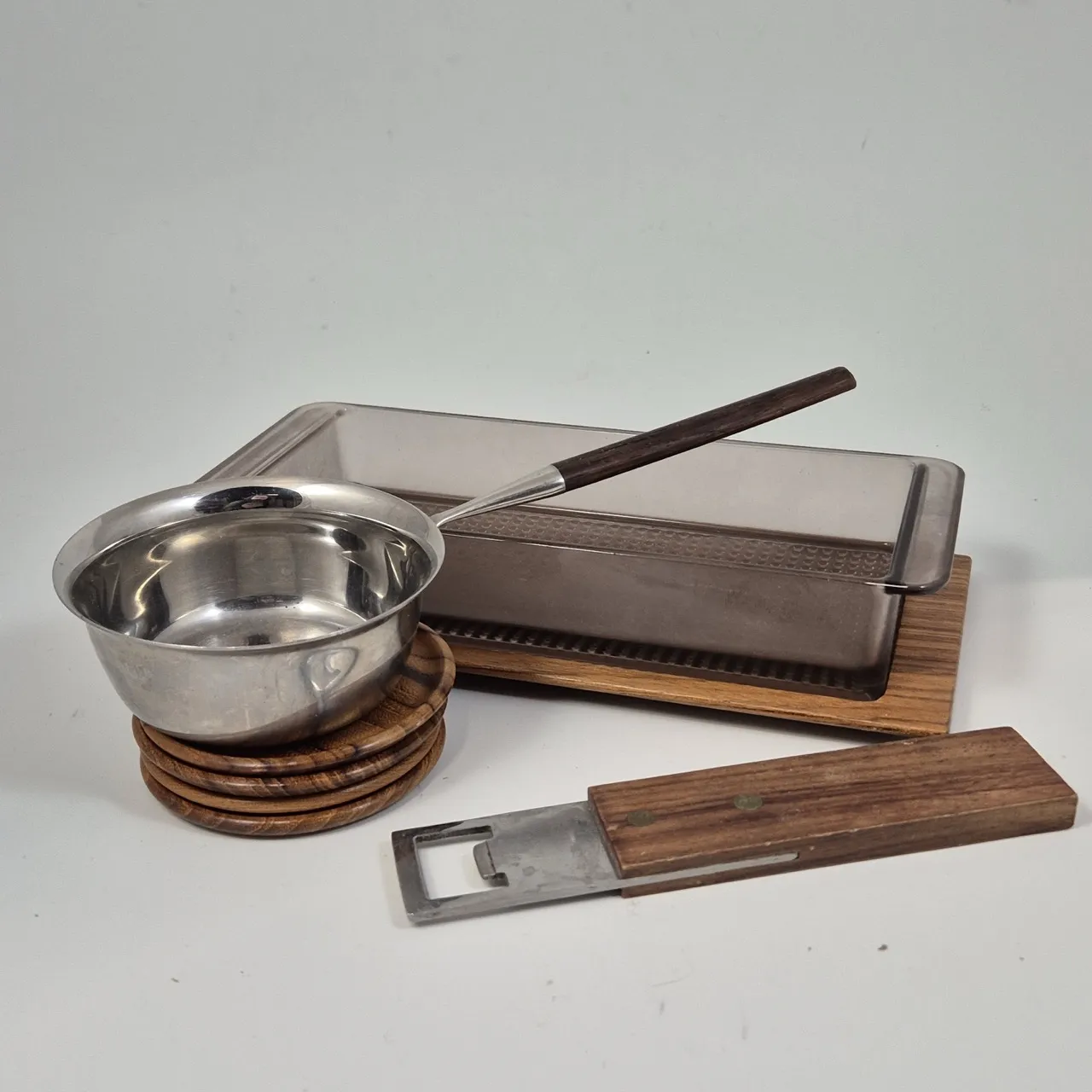 Coasters, serveringsfat på träbricka, kapsylöppnare, smörpanna