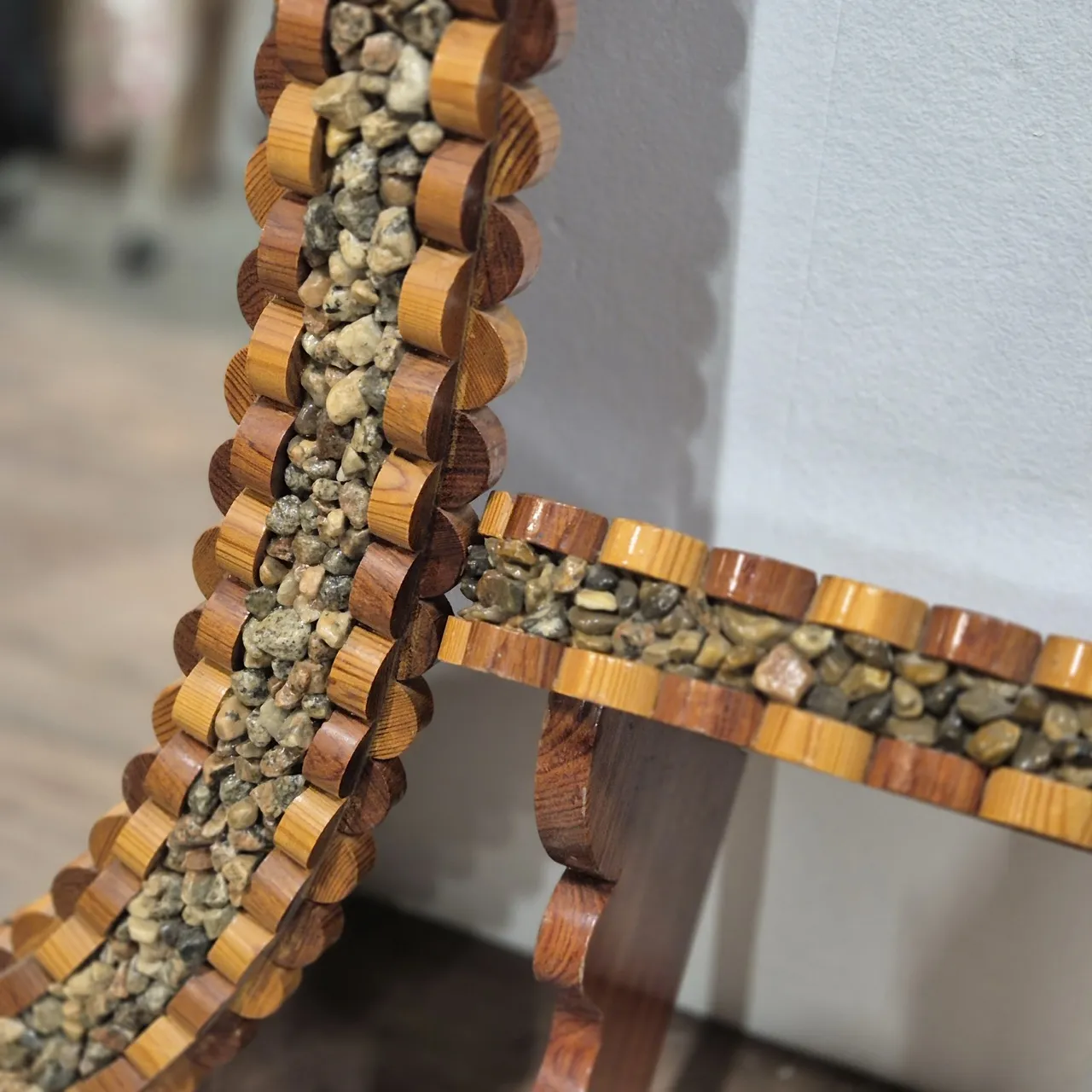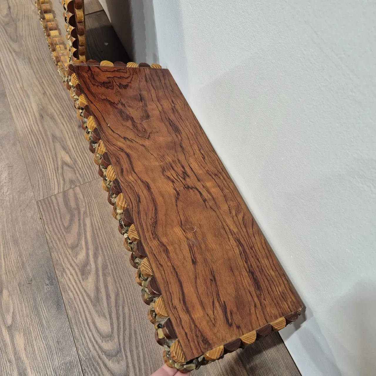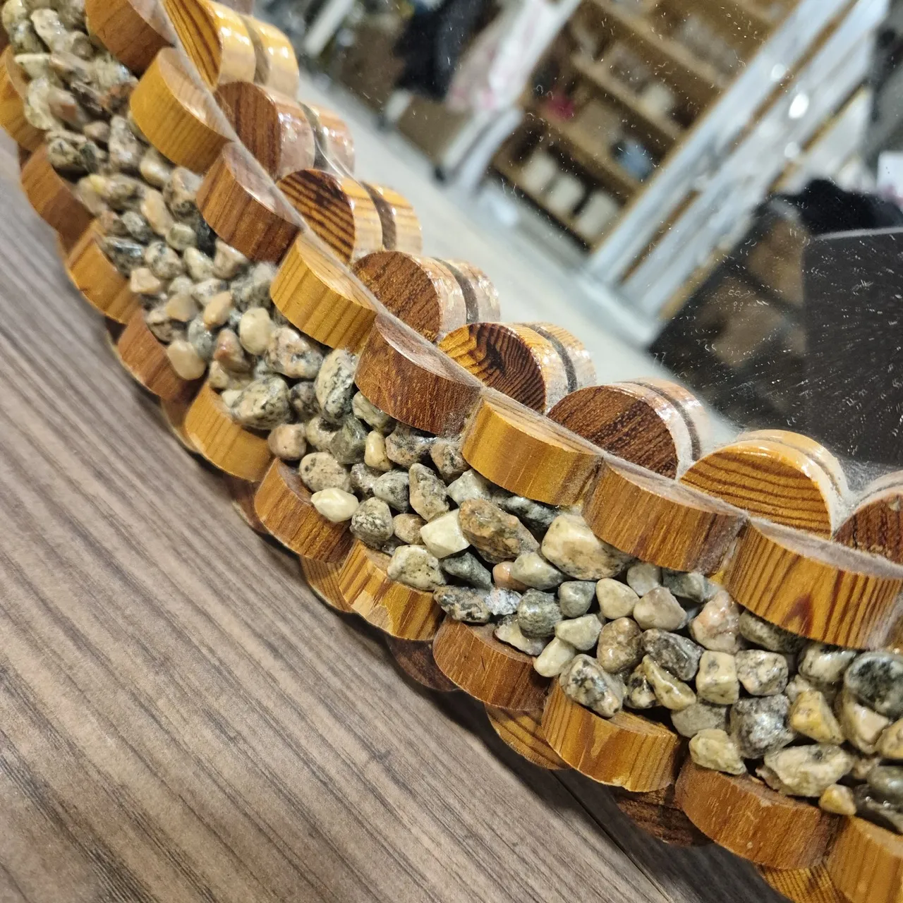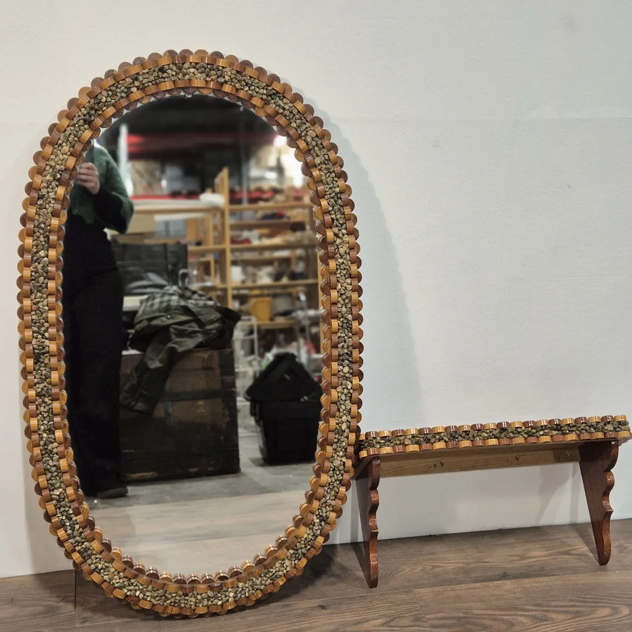 Spegel med en liten hylla. Ram av grus och trä. 2st kantbitar på hyllan fattas. Mått på spegel 106x63cm