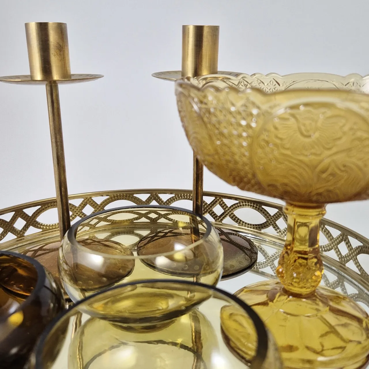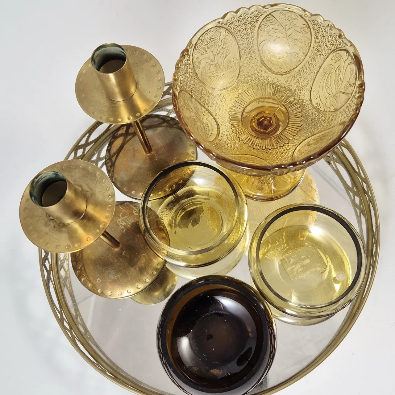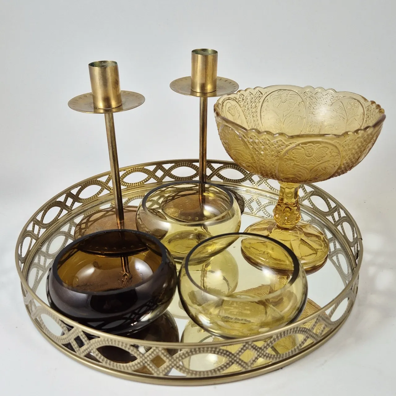 Spegelbricka, 2st ljusstakar, 3st ljuslyktor, 1st skål på fot