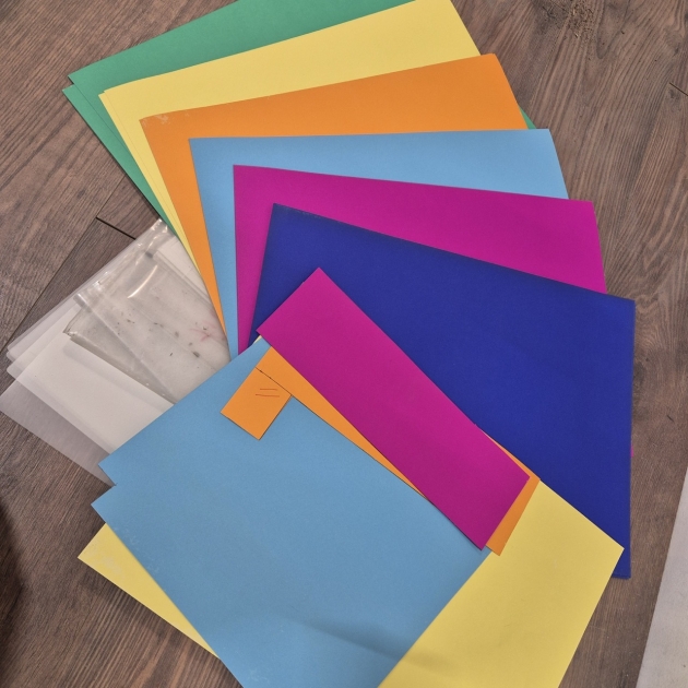 Stora tjocka pappersark i kulörta färger (typ a3 a2) . Lamineringsfickor