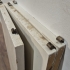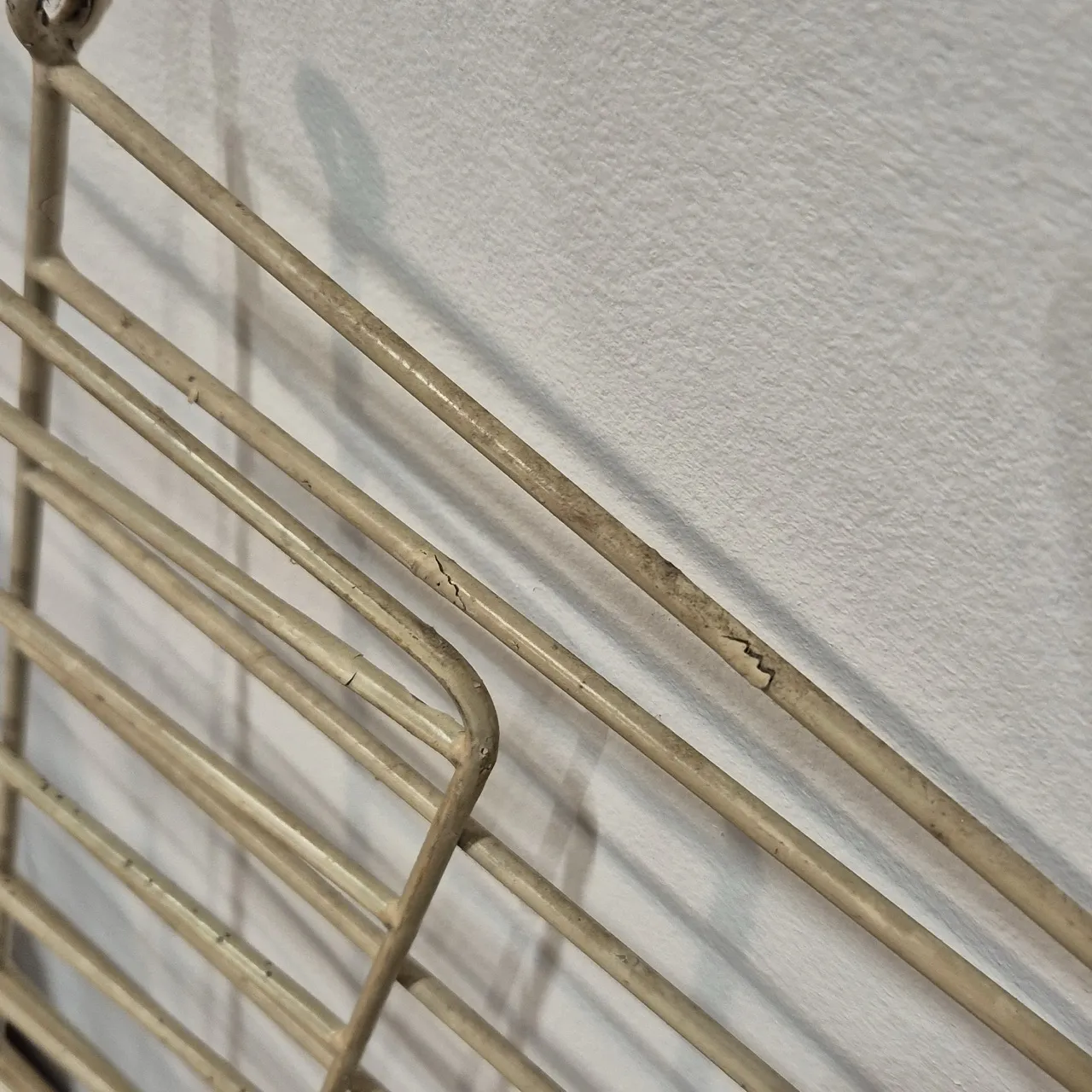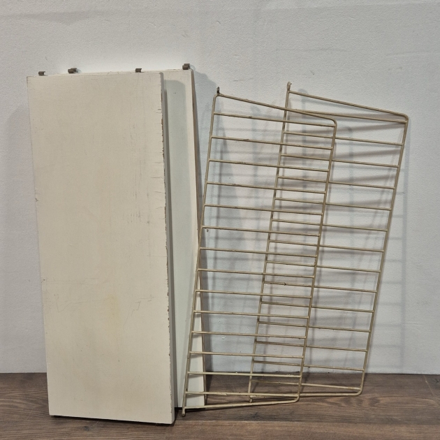 Stringhylla med ommålade hyllplan. Missfärgade gavlar, sprucken plast. Mått gavel 76x28cm Hyllplan 78x30cm