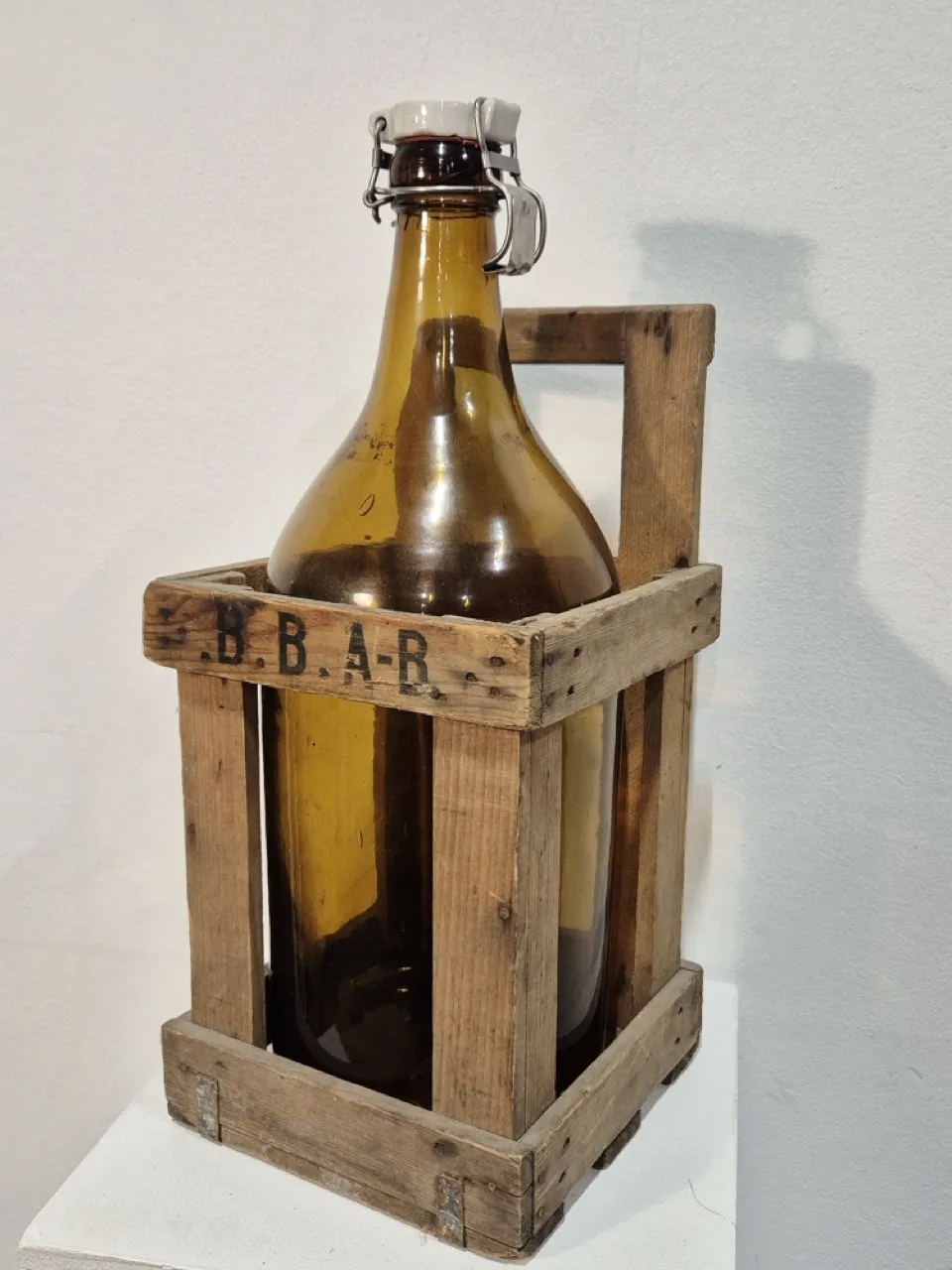 Flaska med träställning. Nyköpings svagdricksbryggeri H.45cm