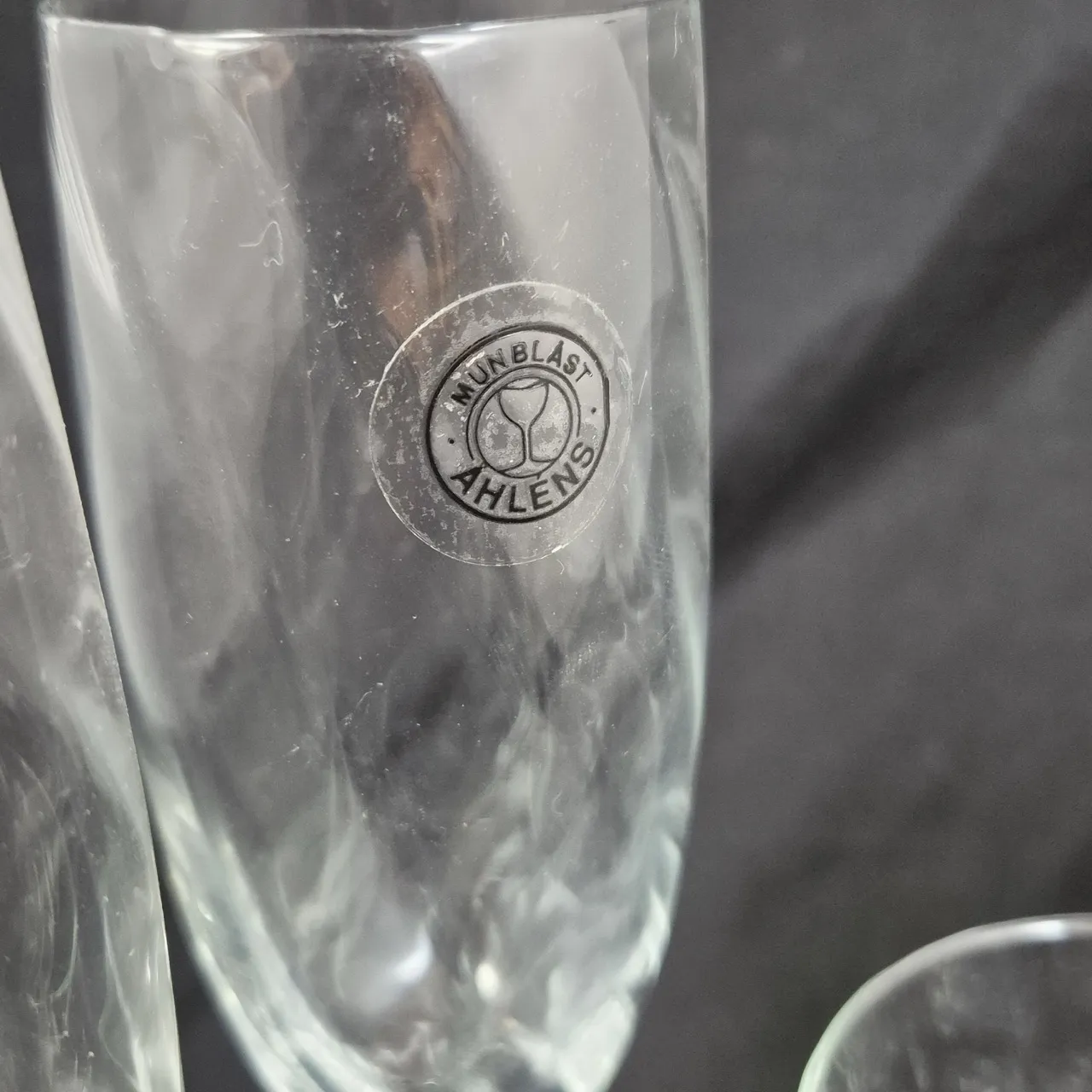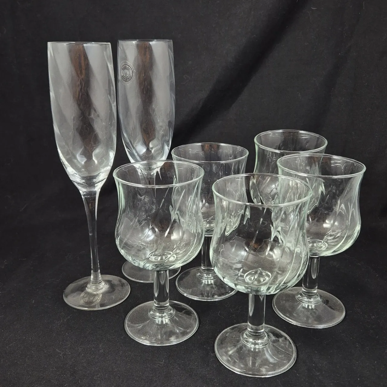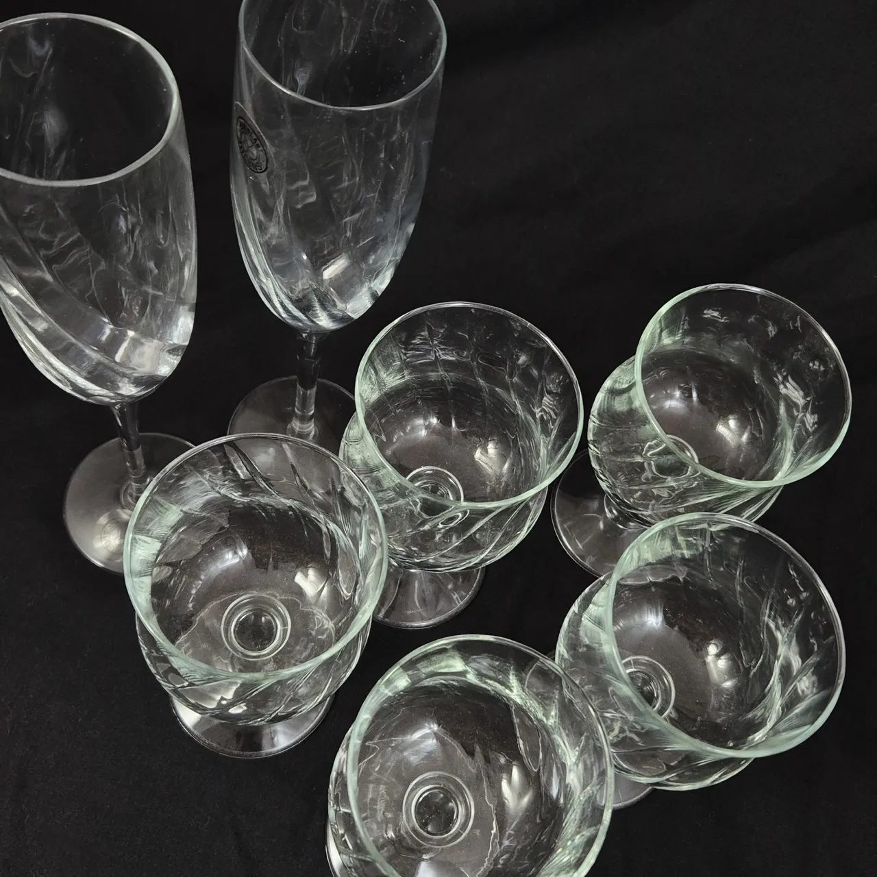 Swirliga glas, 5st vinglas H. 14.5cm , 2st munblåsta champagneglas .