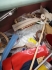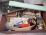 En låda sybehör, t.ex. dragkedjor, stickor mm.