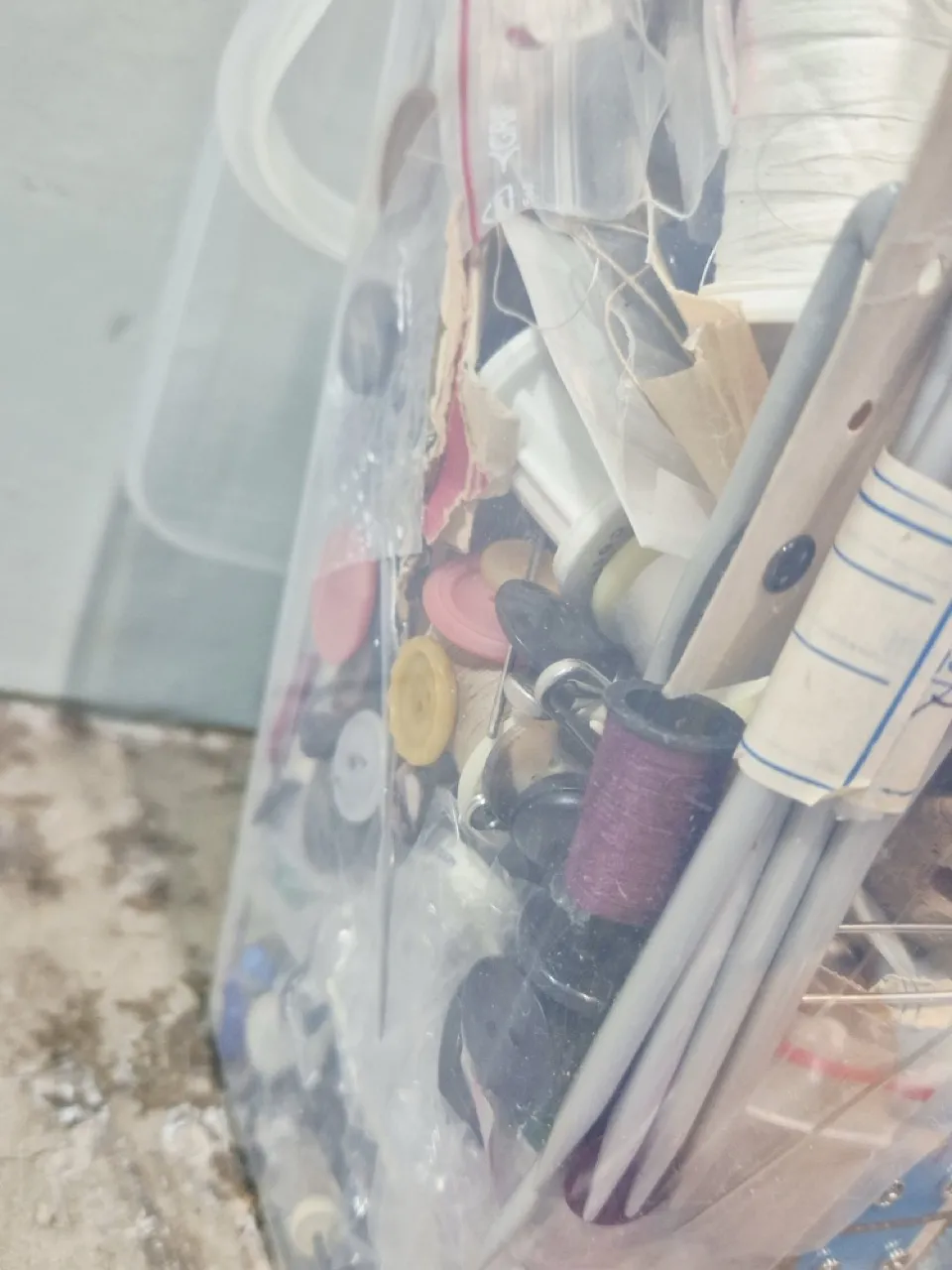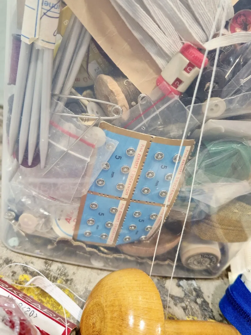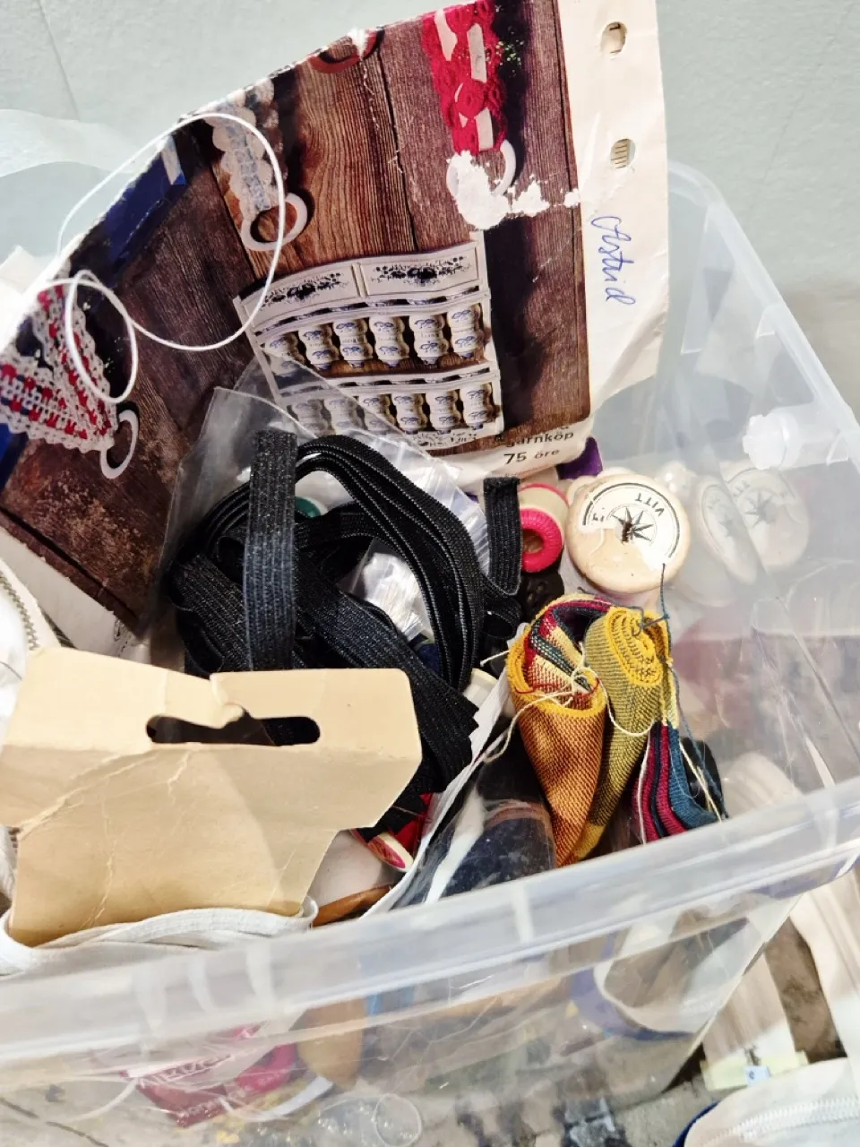 Knappar, tryckknappar i olika storlekar, Symaskinsnålar, nålar trådar, dragkedjor, stoppsvamp och annat