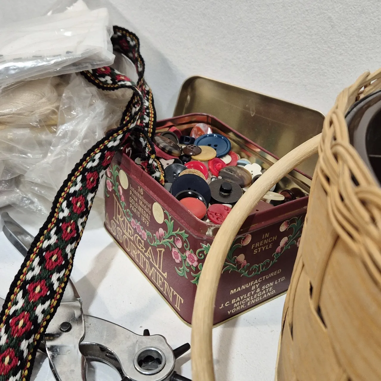 Sybehör- Hålslag, knappar, broderigarn, Sykorg med mera