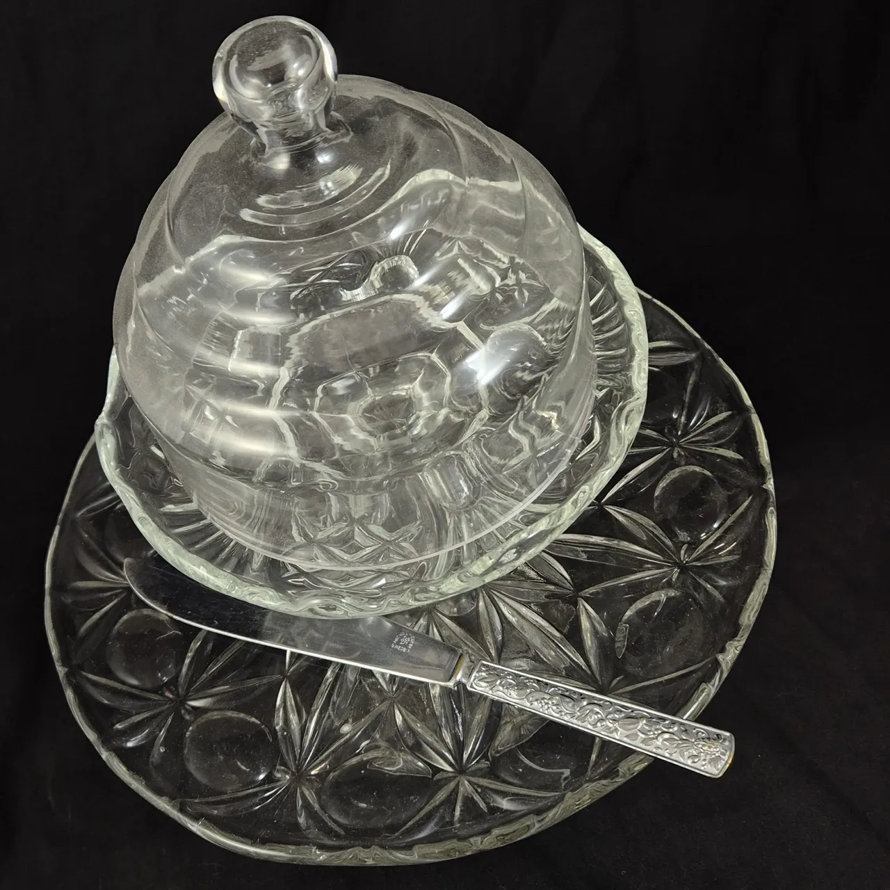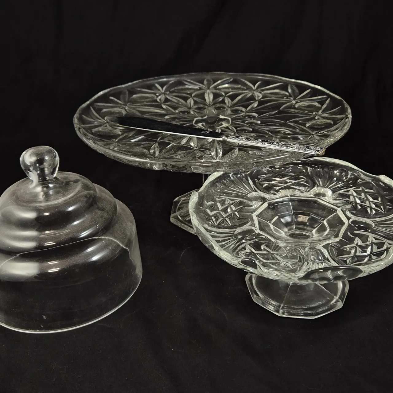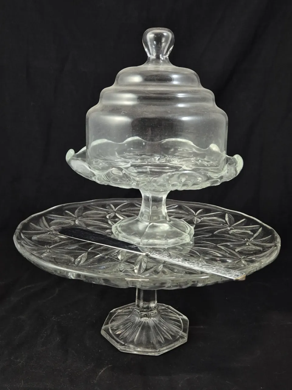 Tårtfat på fot D.28cm , fat med glaskupa, tårtkniv