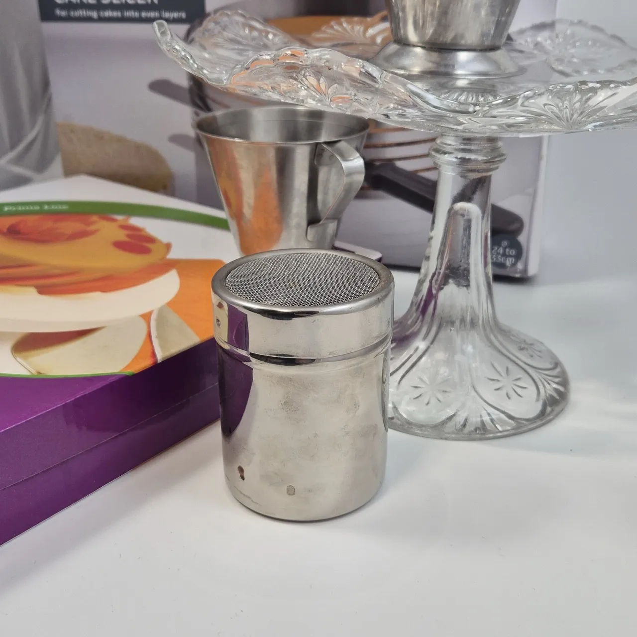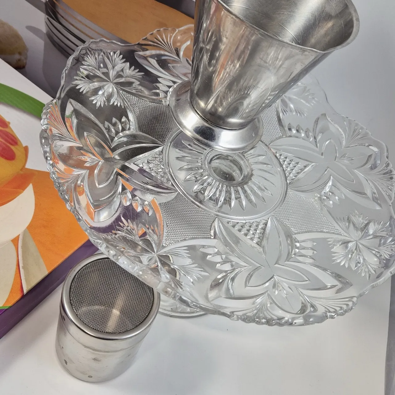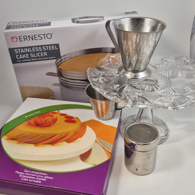 Tårtfat på fot, ströare, måttkanna, snurrbricka, tårtbottenskärare