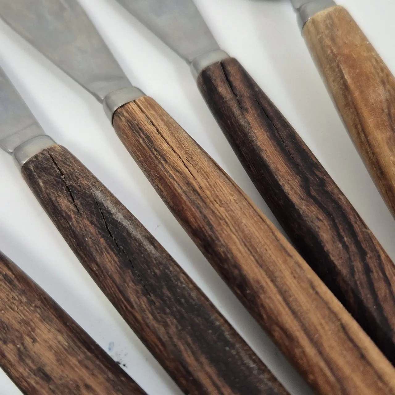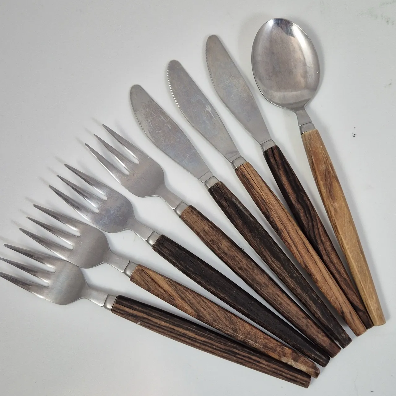 Retro bestick med teakhandtag .4st gafflar, 3st knivar . Sprickor finns