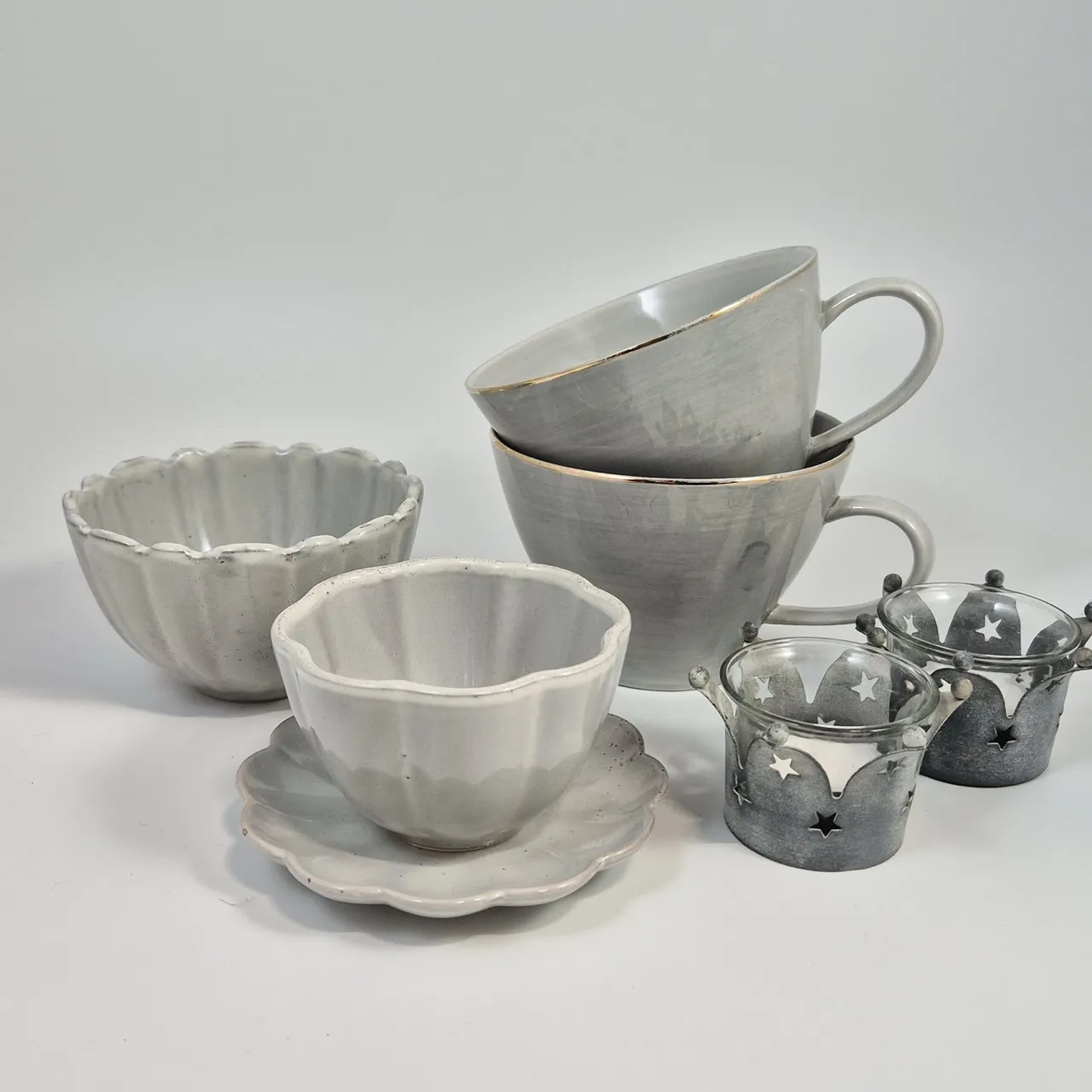 2st stora tekoppar med guldig kant, 2st skålar, 2st ljuslyktor