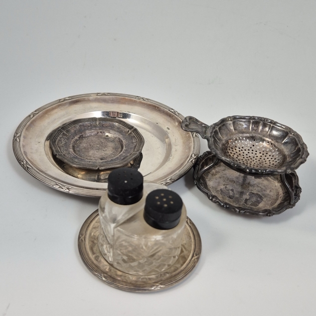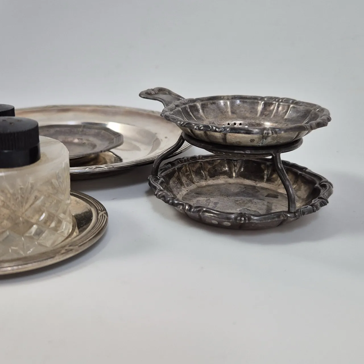Tesil med hållare nysilver, liten bricka, sat och pepparkar