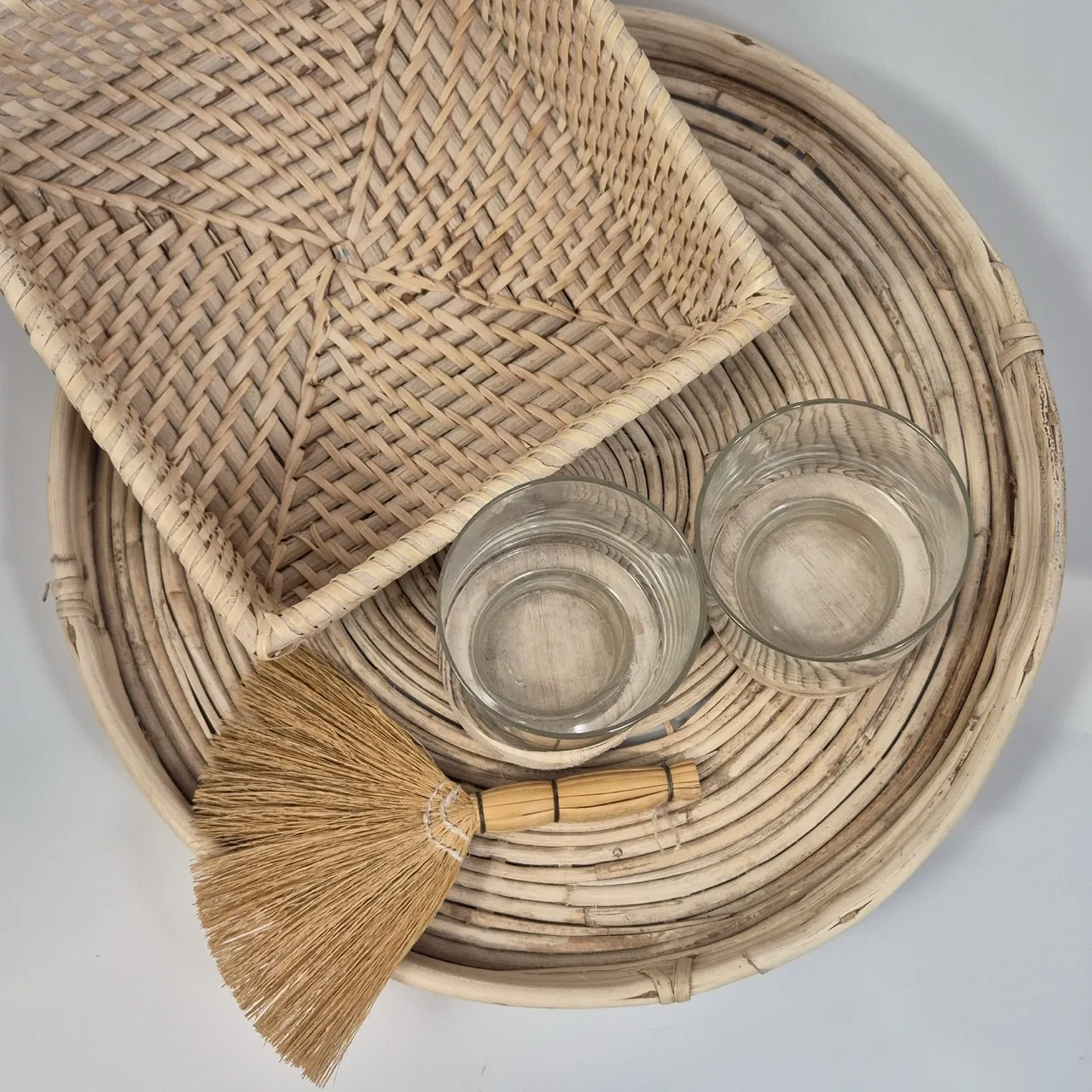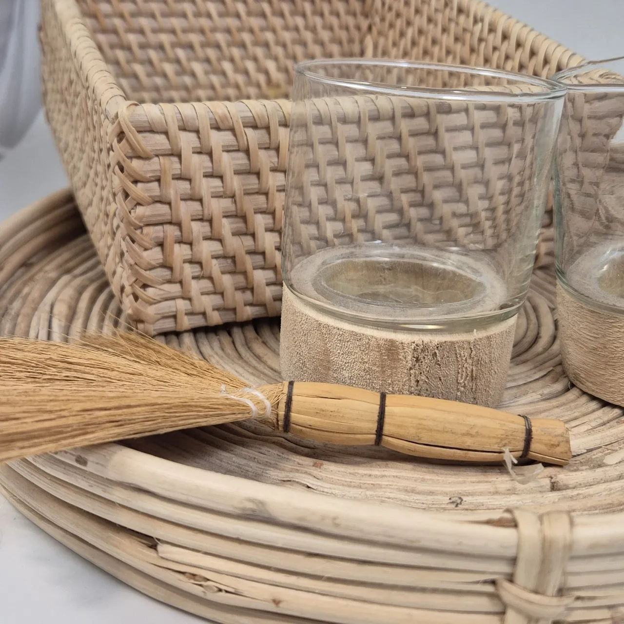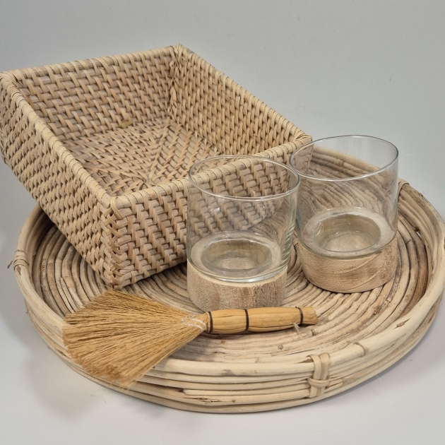 Träbricka D.35cm, 2st ljuslyktor, korg