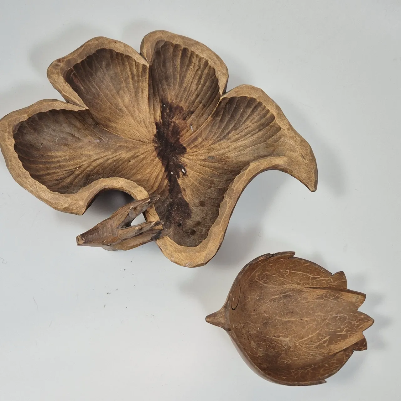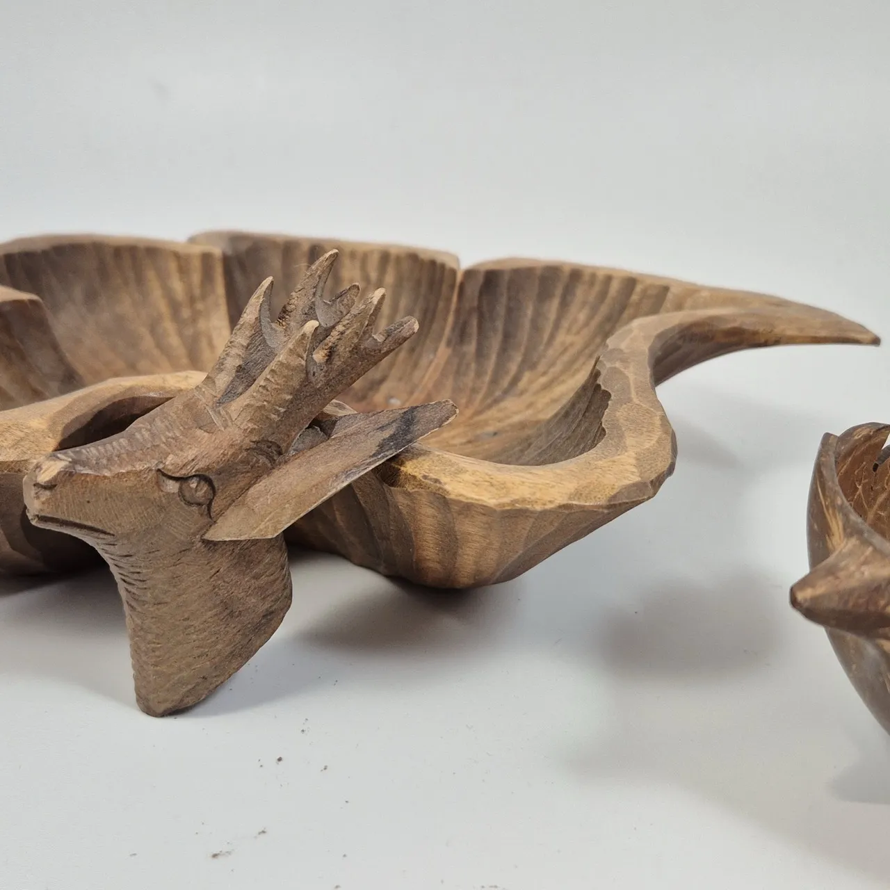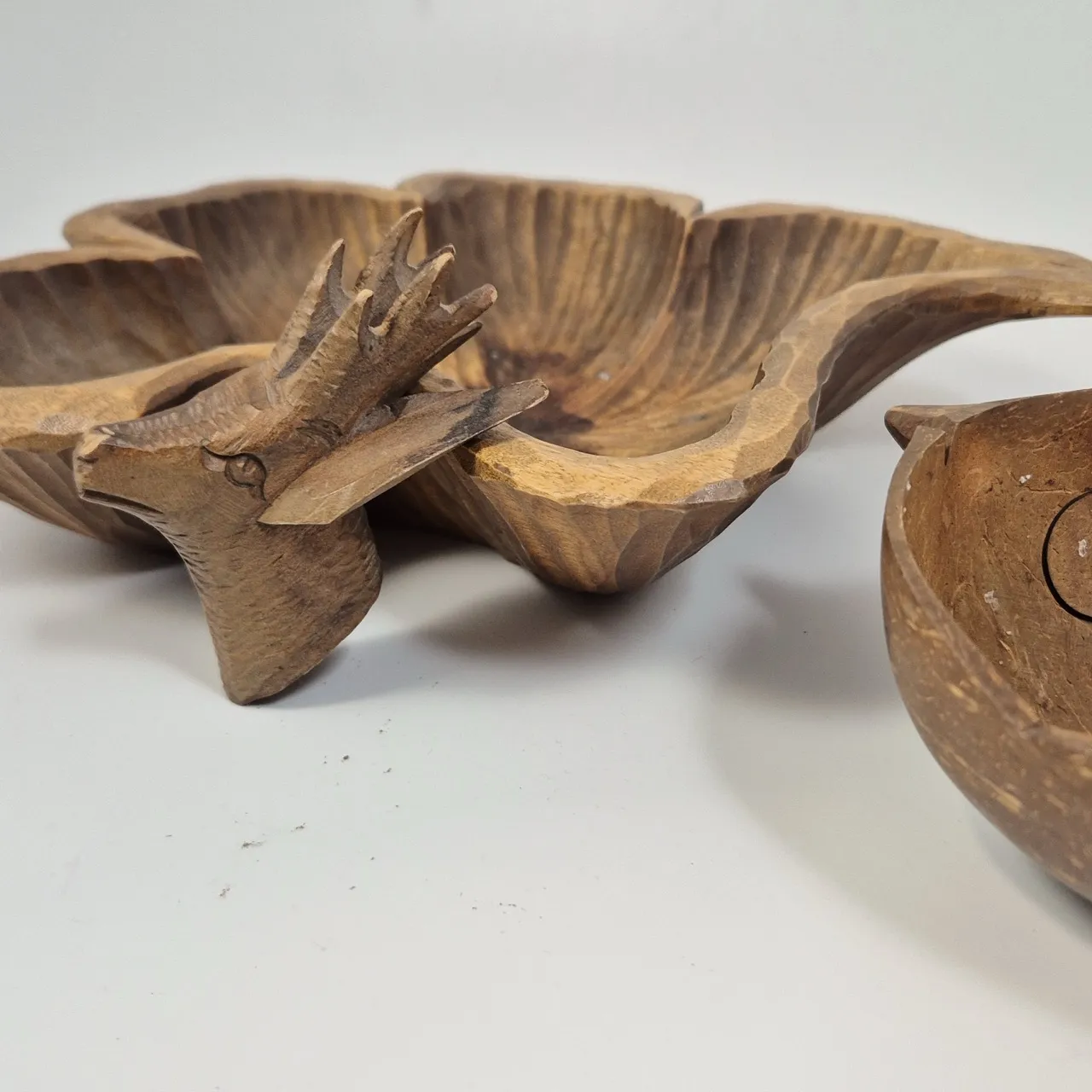 2st fina skålar av trä Största D.ca 28cm Ett litet bockhuvud.