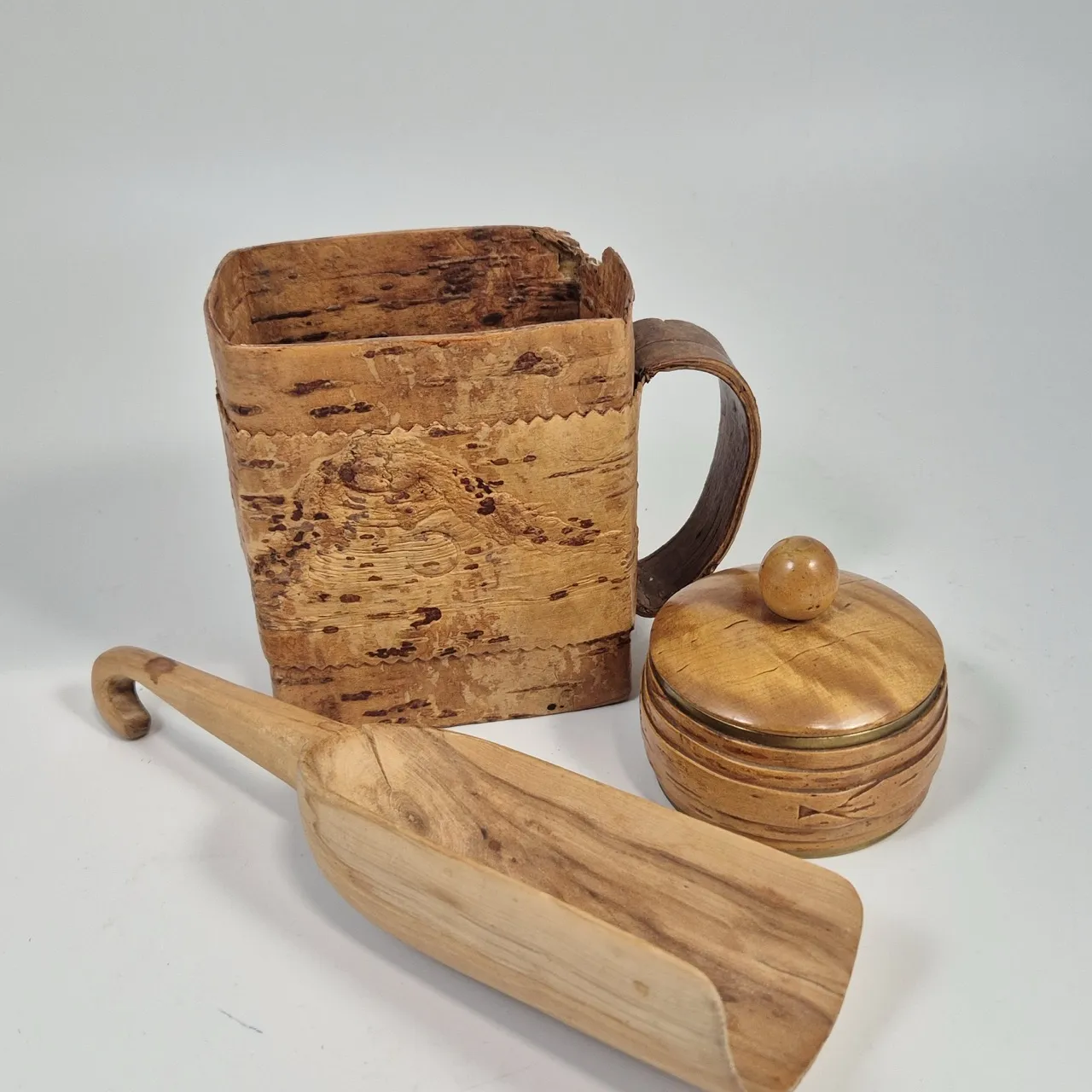 Träskopa, näver hölje(för gamla mjölkpaket) Burk i näver med mässing inuti