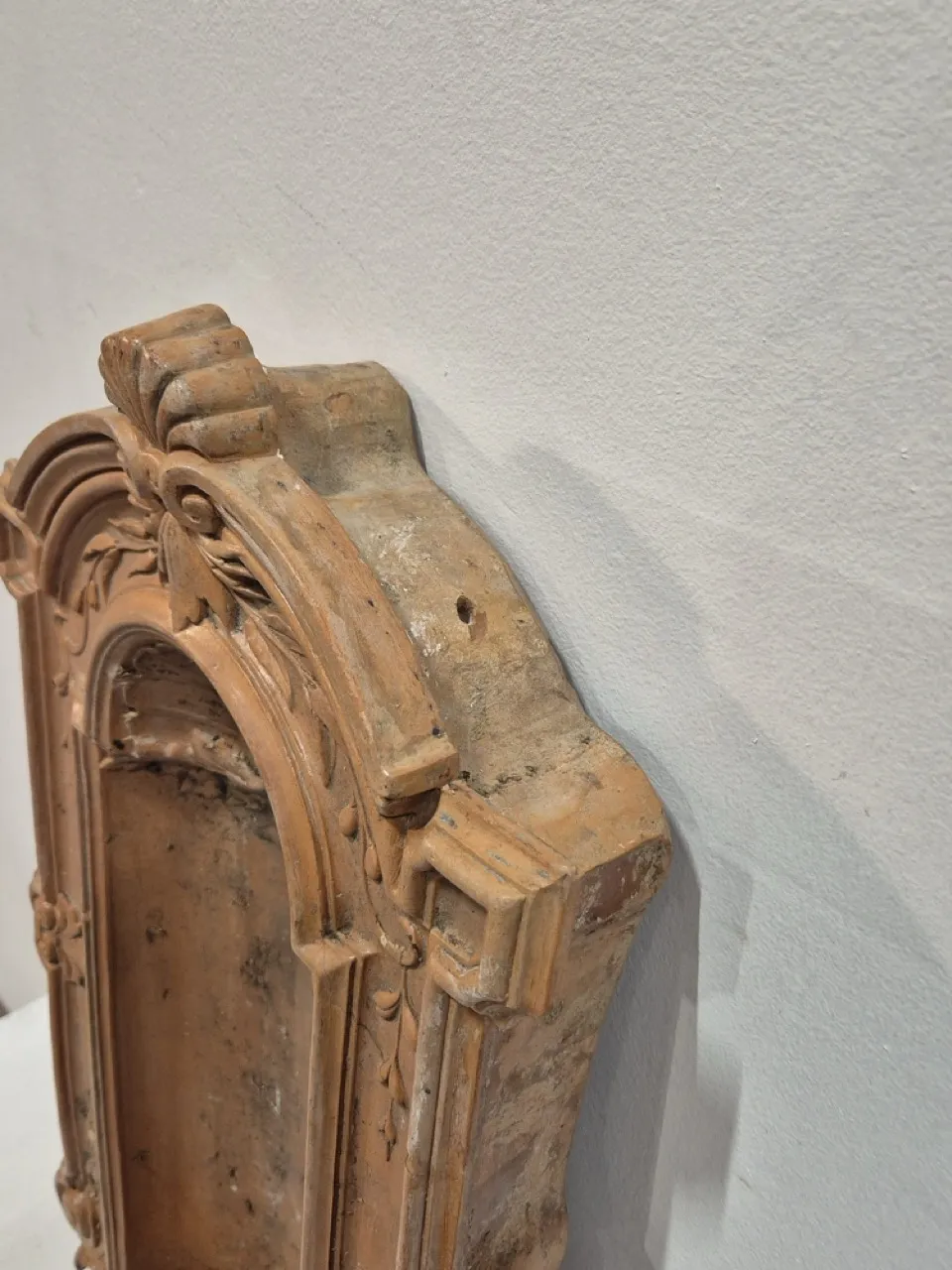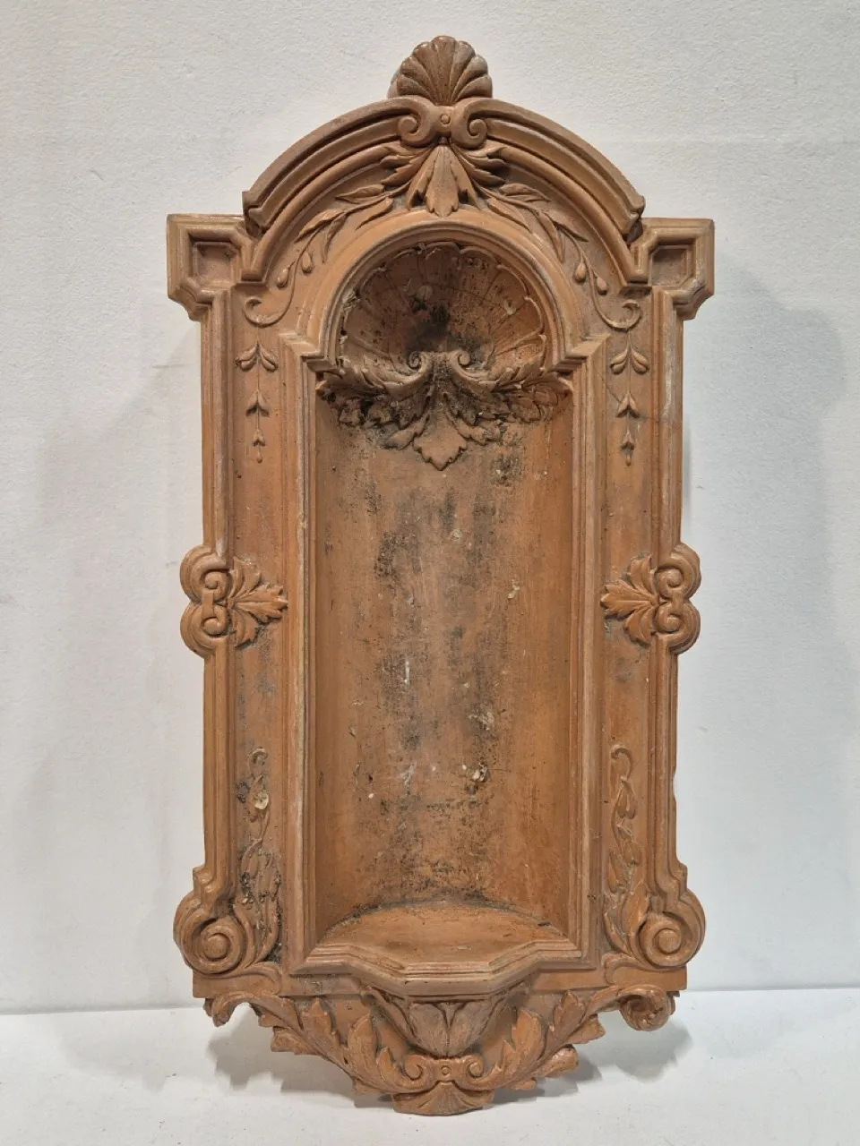 Väggdekoration i terrakotta som man kan ställa staty, kruka eller annat i. Pampig! H.65cm B.34cm Djup 12cm