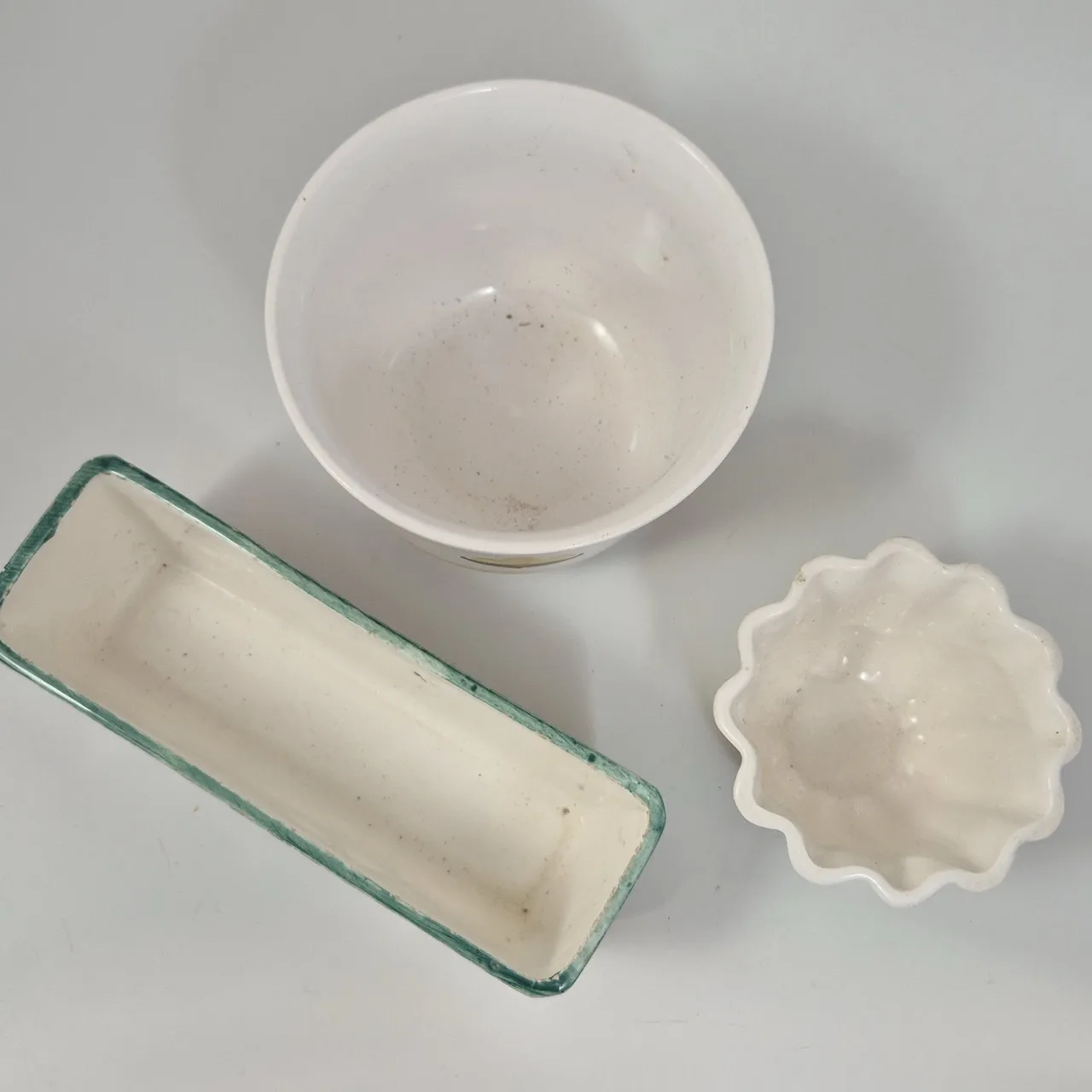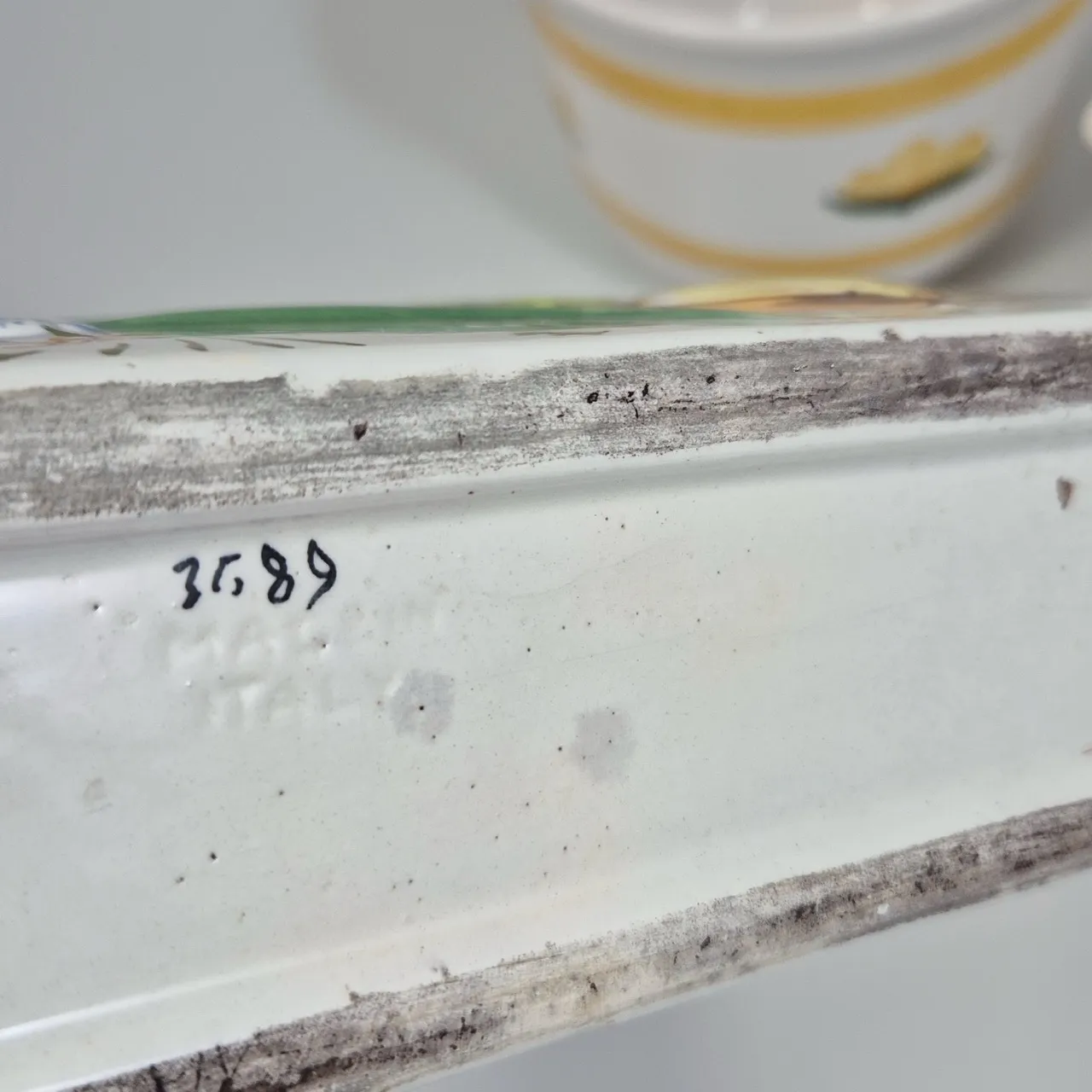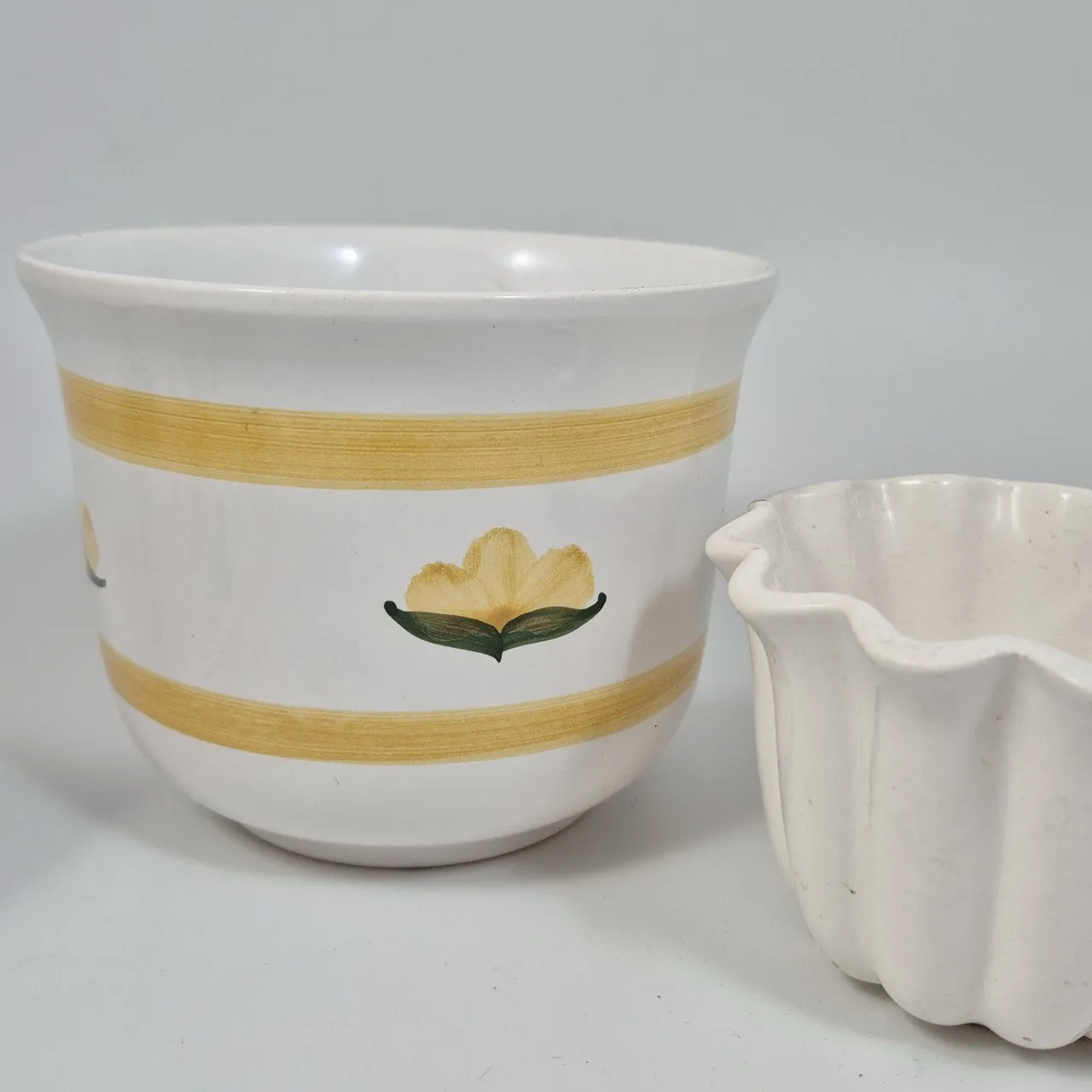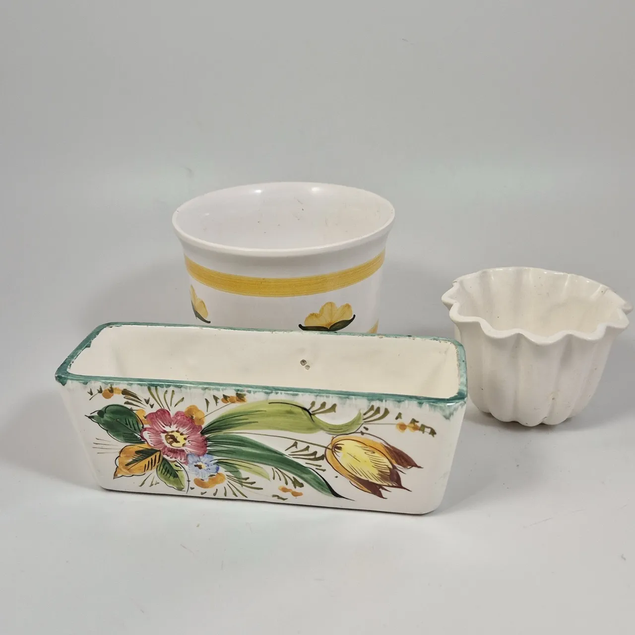 Vårig avlång kruka. L.21cm. Småsmå nagg på kanten. Kruka gul