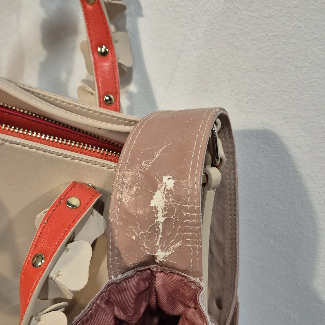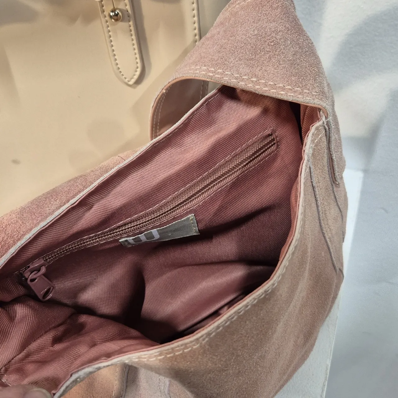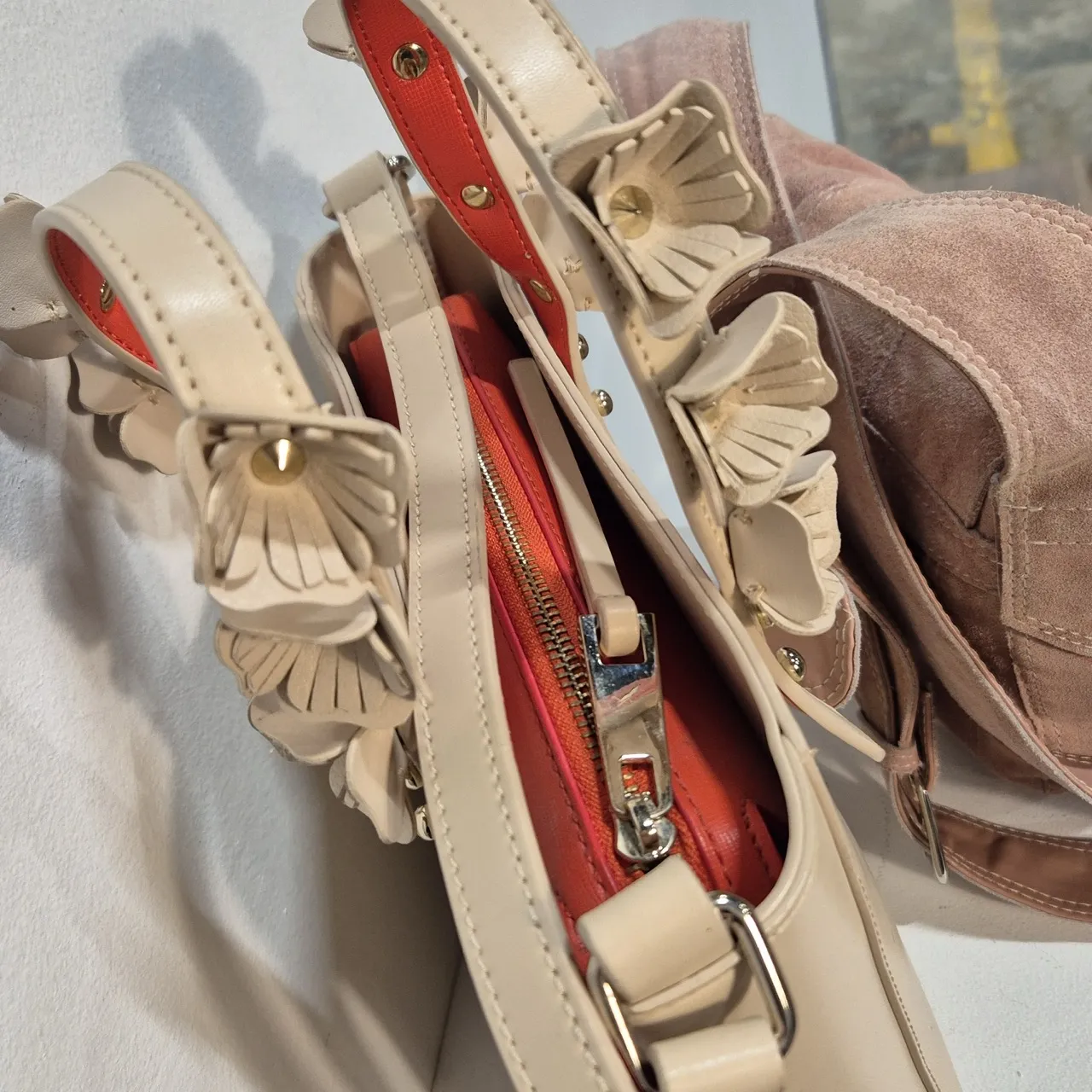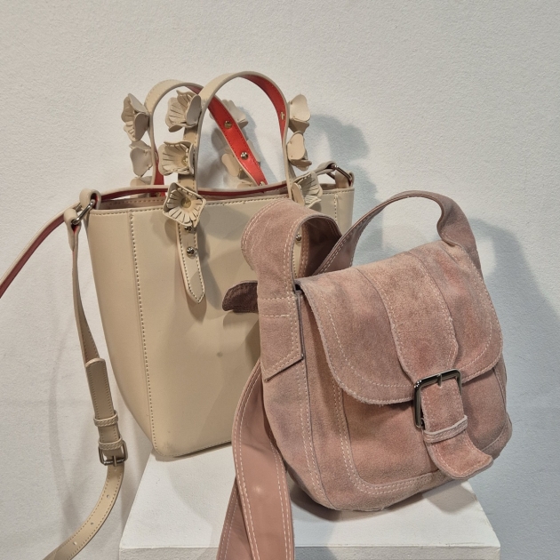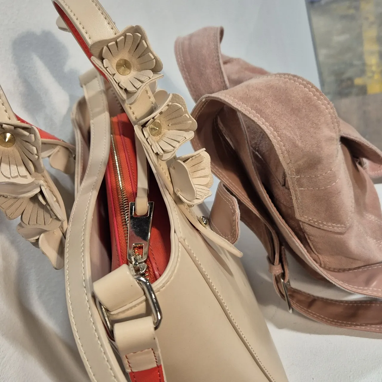 2st våriga väskor i ljusrosa. Den med blommiga handtag är ca 23x23cm utan handtag