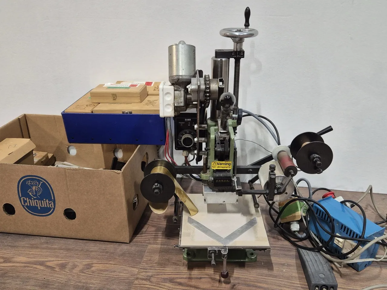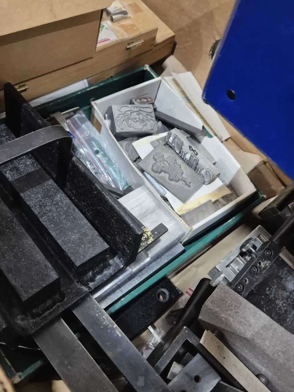 Varmpräglingsmaskin. Ej testad. Massa präglingstyper i olika typsnitt, bilder och tillbehör .