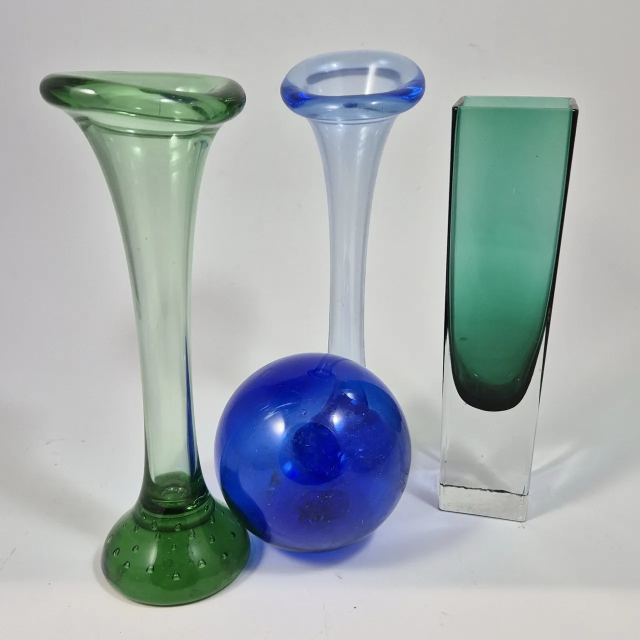 3 st olika vaser. Den gröna är 23.5cm , glasklot