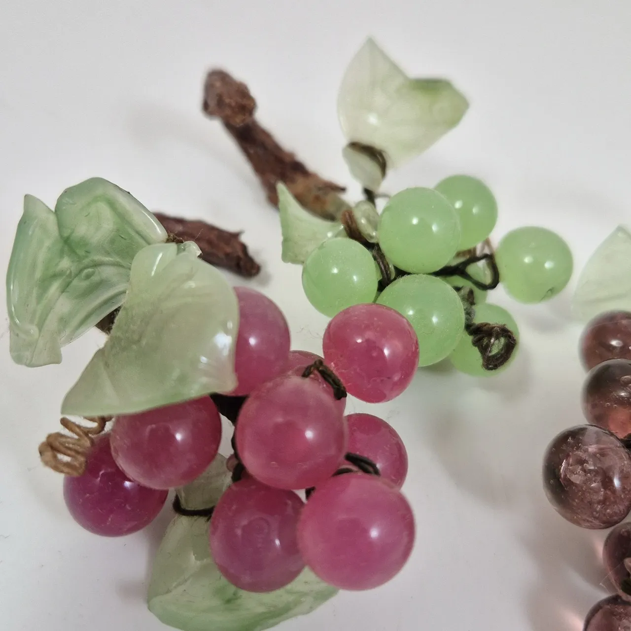 Små vindruvsklasar i glas. Tyvärr har alla trasiga blad. L. ca 8cm