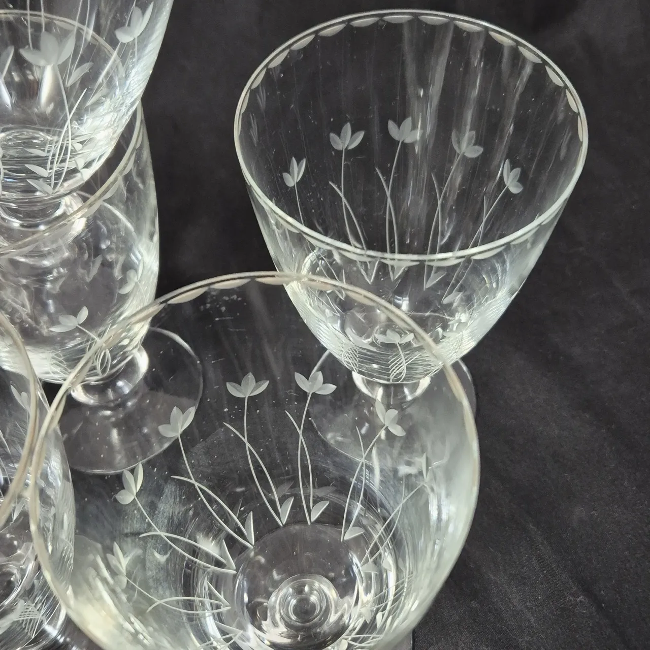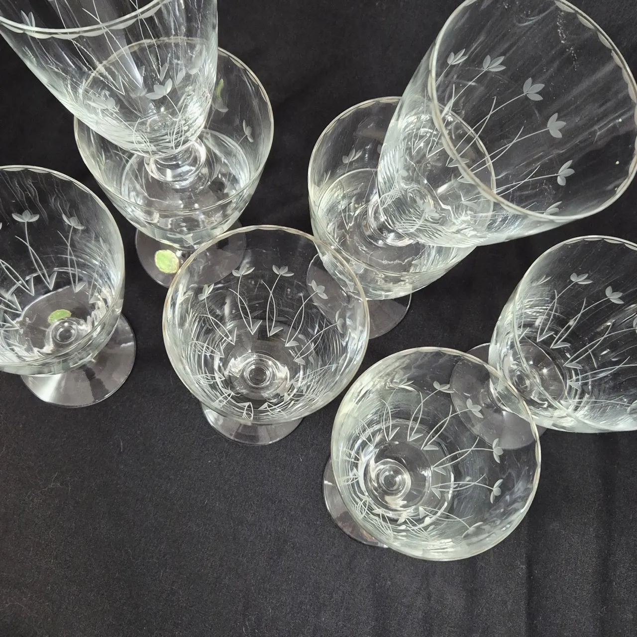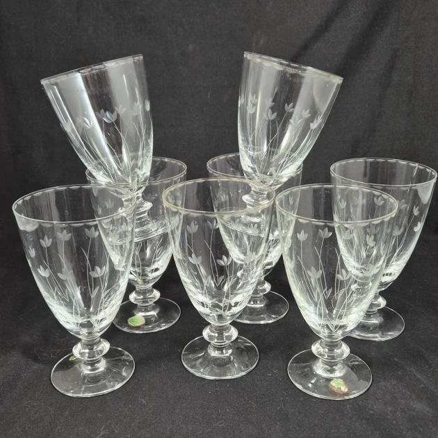 8st vinglas från Kosta med slipade vårblommor. H. 13.5cm